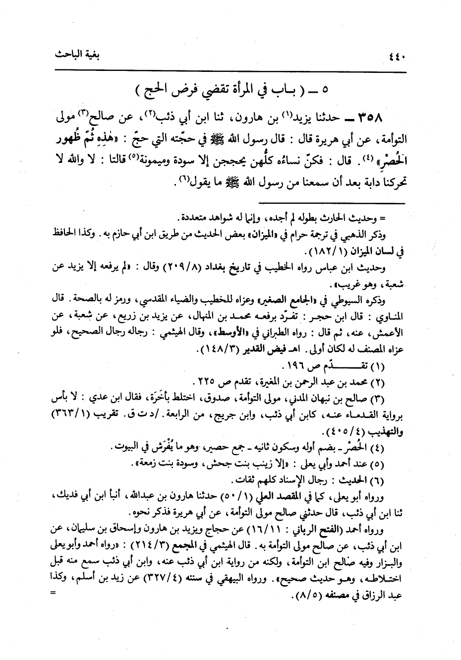 358 - حَدَّثَنَا يَزِيدُ بْنُ هَارُونَ، ثنا ابْنُ أَبِي ذِئْبٍ، عَنْ صَالِحٍ مَوْلَى التَّوْأَمَةِ , عَنْ أَبِي هُرَيْرَةَ قَالَ: قَالَ رَسُولُ اللَّهِ صَلَّى اللهُ عَلَيْهِ وَسَلَّمَ فِي حَجَّتِهِ الَّتِي حَجَّ: «§هَذِهِ ثُمَّ ظُهُورُ الْحُصْرِ» قَالَ: فَكُنَّ نِسَاؤُهُ كُلُّهُنَّ يَحْجُجْنَ إِلَّا سَوْدَةُ وَمَيْمُونَةُ قَالَتَا: لَا وَاللَّهِ لَا تُحَرِّكُنَا دَابَّةٌ بَعْدَ أَنَّ سَمِعْنَا مِنْ رَسُولِ اللَّهِ صَلَّى اللهُ عَلَيْهِ وَسَلَّمَ مَا يَقُولُ