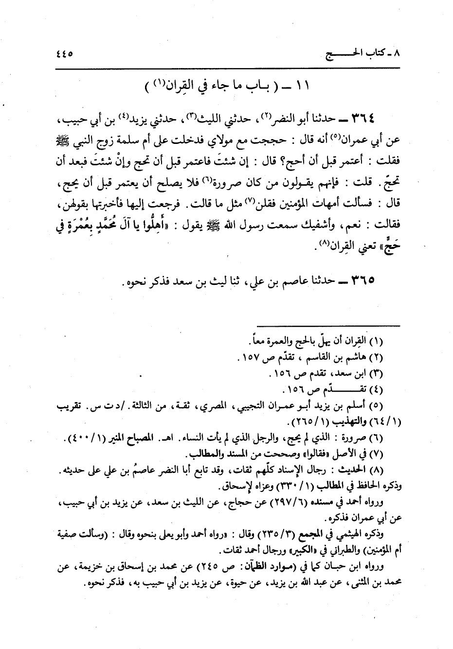 364 - حَدَّثَنَا أَبُو النَّضْرِ، حَدَّثَنِي اللَّيْثُ، حَدَّثَنِي يَزِيدُ بْنُ أَبِي حَبِيبٍ، عَنْ أَبِي عِمْرَانَ أَنَّهُ قَالَ: حَجَجْتُ مَعَ مَوْلَايَ فَدَخَلْتُ عَلَى أُمِّ سَلَمَةَ زَوْجِ النَّبِيِّ صَلَّى اللهُ عَلَيْهِ وَسَلَّمَ فَقُلْتُ: أَعْتَمِرُ قَبْلَ أَنْ أَحُجَّ؟ قَالَتْ: إنْ شِئْتَ فَاعْتَمِرْ قَبْلَ أَنْ تَحُجَّ وَإِنْ شِئْتَ فَبَعْدَ أَنْ تَحُجَّ , قُلْتُ: فَإِنَّهُمْ يَقُولُونَ مَنْ كَانَ صَرُورَةً فَلَا يَصْلُحُ أَنْ يَعْتَمِرَ قَبْلَ أَنْ يَحُجَّ قَالَ: فَسَأَلْتُ أُمَّهَاتِ الْمُؤْمِنِينَ فَقُلْنَ مِثْلَ مَا قَالَتْ: فَرَجَعْتُ إِلَيْهَا فَأَخْبَرْتُهَا بِقَوْلِهِنَّ فَقَالَتْ: نَعَمْ وَأُشْفِيكَ سَمِعْتُ رَسُولَ اللَّهِ صَلَّى اللهُ عَلَيْهِ وَسَلَّمَ يَقُولُ: «§أَهِلُّوا يَا آلَ مُحَمَّدٍ بِعُمْرَةٍ فِي حَجٍّ» ، تَعْنِي الْقِرَانَ "