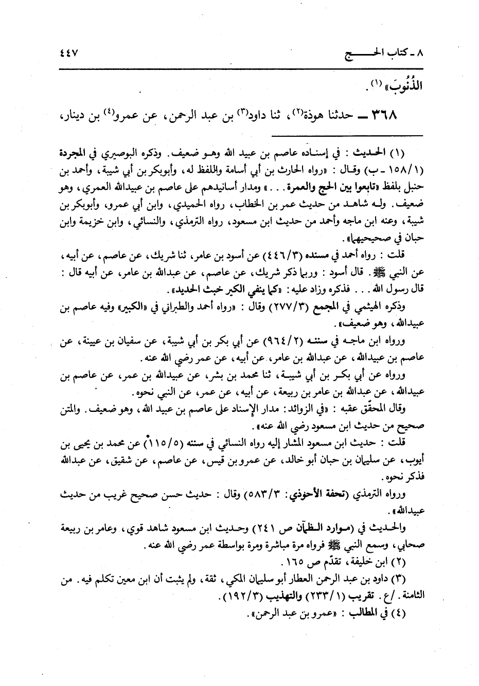 368 - حَدَّثَنَا هَوْذَةُ، ثنا دَاوُدُ بْنُ عَبْدِ الرَّحْمَنِ، عَنْ عَمْرِو بْنِ دِينَارٍ، عَنِ ابْنٍ لِعَبْدِ اللَّهِ بْنِ عُمَرَ أَنَّ رَسُولَ اللَّهِ صَلَّى اللهُ عَلَيْهِ وَسَلَّمَ قَالَ: «§تَابِعُوا بَيْنَ الْحَجِّ وَالْعُمْرَةِ فَإِنَّ الْمُتَابَعَةَ بَيْنَهُمَا يَنْفِيَانِ الْفَقْرَ وَالذُّنُوبَ كَمَا تَنْفِي الْكِيرُ خَبَثَ الْحَدِيدِ»