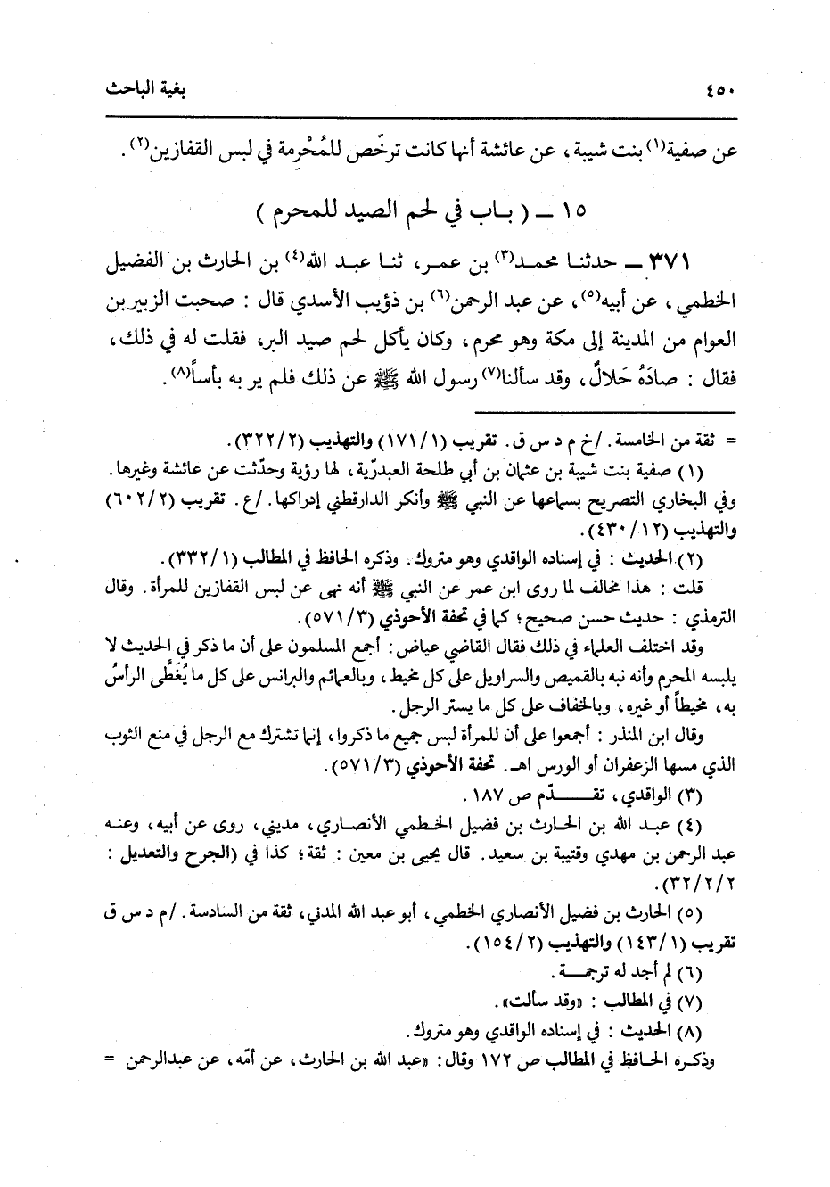 371 - حَدَّثَنَا مُحَمَّدُ بْنُ عُمَرَ، ثنا عَبْدُ اللَّهِ بْنُ الْحَارِثِ بْنِ الْفُضَيْلِ الْخَطْمِيُّ، عَنْ أَبِيهِ، عَنْ عَبْدِ الرَّحْمَنِ بْنِ ذُؤَيْبٍ الْأَسَدِيِّ قَالَ: صَحِبْتُ الزُّبَيْرَ بْنَ الْعَوَّامِ مِنَ الْمَدِينَةِ إِلَى مَكَّةَ وَهُوَ مُحْرِمٌ وَكَانَ " §يَأْكُلُ لَحْمَ صَيْدِ الْبَرِّ فَقُلْتُ لَهُ فِي ذَلِكَ فَقَالَ: صَادَهُ حَلَالٌ وَقَدْ سَأَلْنَا رَسُولَ اللَّهِ صَلَّى اللهُ عَلَيْهِ وَسَلَّمَ عَنْ ذَلِكَ فَلَمْ يَرَ بِهِ بَأْسًا "
