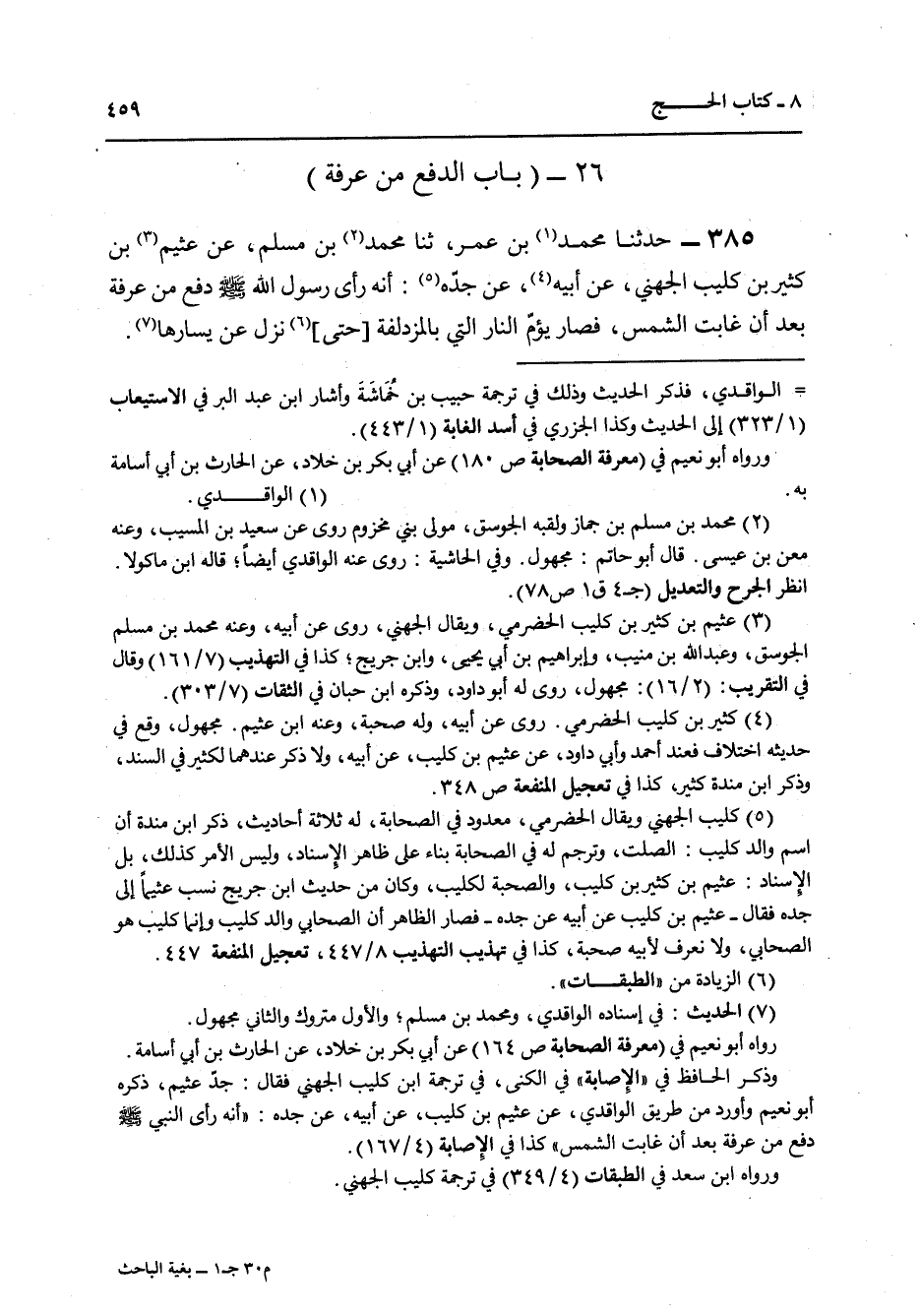 385 - حَدَّثَنَا مُحَمَّدُ بْنُ عُمَرَ، ثنا مُحَمَّدُ بْنُ مُسْلِمٍ، عَنْ عُثَيْمِ بْنِ كَثِيرِ بْنِ كُلَيْبٍ الْجُهَنِيِّ، عَنْ أَبِيهِ، عَنْ جَدِّهِ، أَنَّهُ رَأَى رَسُولَ اللَّهِ صَلَّى اللهُ عَلَيْهِ وَسَلَّمَ «§دَفَعَ مِنْ عَرَفَةَ بَعْدَ أَنْ غَابَتِ الشَّمْسُ فَصَارَ يَؤُمُّ النَّارَ الَّتِي بِالْمُزْدَلِفَةِ حَتَّى نَزَلَ عَنْ يَسَارِهَا»