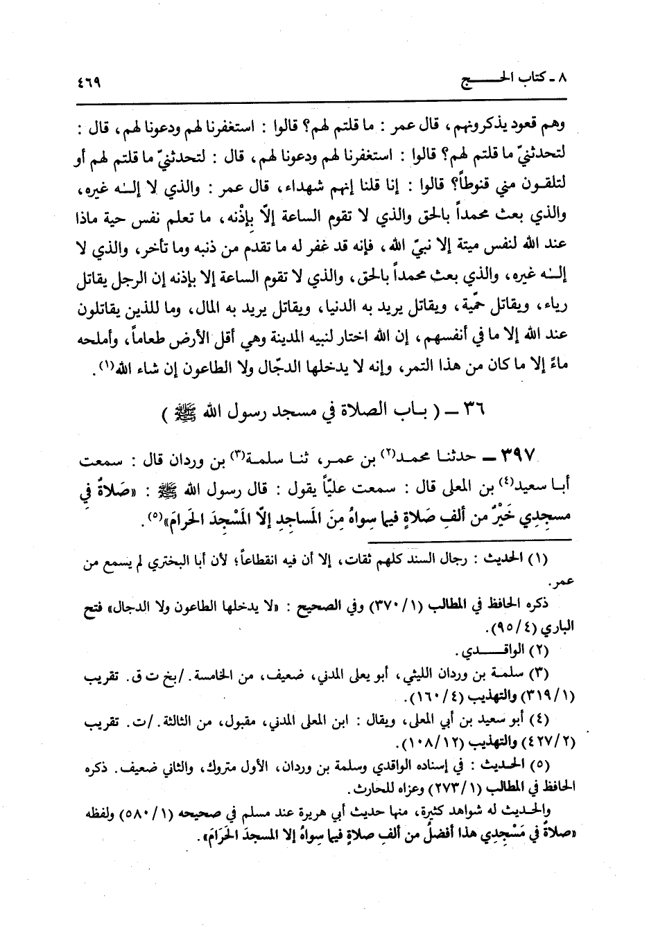 397 - حَدَّثَنَا مُحَمَّدُ بْنُ عُمَرَ، ثنا سَلَمَةُ بْنُ وَرْدَانَ قَالَ: سَمِعْتُ أَبَا سَعِيدِ بْنَ الْمُعَلَّى قَالَ: سَمِعْتُ عَلِيًّا يَقُولُ: قَالَ رَسُولُ اللَّهِ صَلَّى اللهُ عَلَيْهِ وَسَلَّمَ: «§صَلَاةٌ فِي مَسْجِدِي خَيْرٌ مِنْ أَلْفِ صَلَاةٍ فِيمَا سِوَاهُ مِنَ الْمَسَاجِدِ إِلَّا الْمَسْجِدَ الْحَرَامِ»