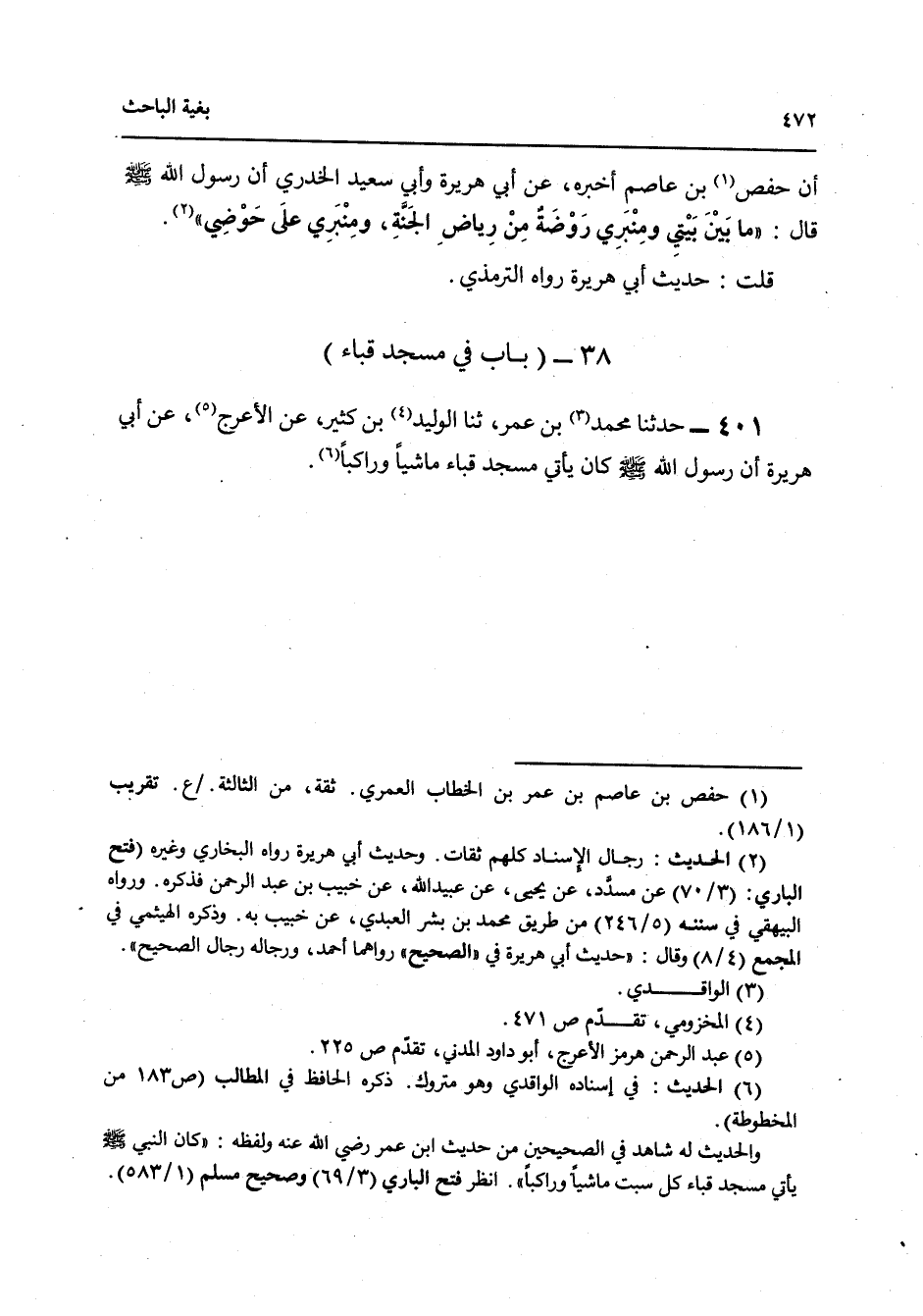 401 - حَدَّثَنَا مُحَمَّدُ بْنُ عُمَرَ، ثنا الْوَلِيدُ بْنُ كَثِيرٍ، عَنِ الْأَعْرَجِ، عَنْ أَبِي هُرَيْرَةَ أَنَّ رَسُولَ اللَّهِ صَلَّى اللهُ عَلَيْهِ وَسَلَّمَ كَانَ «§يَأْتِي مَسْجِدَ قُبَاءٍ مَاشِيًا وَرَاكِبًا»
