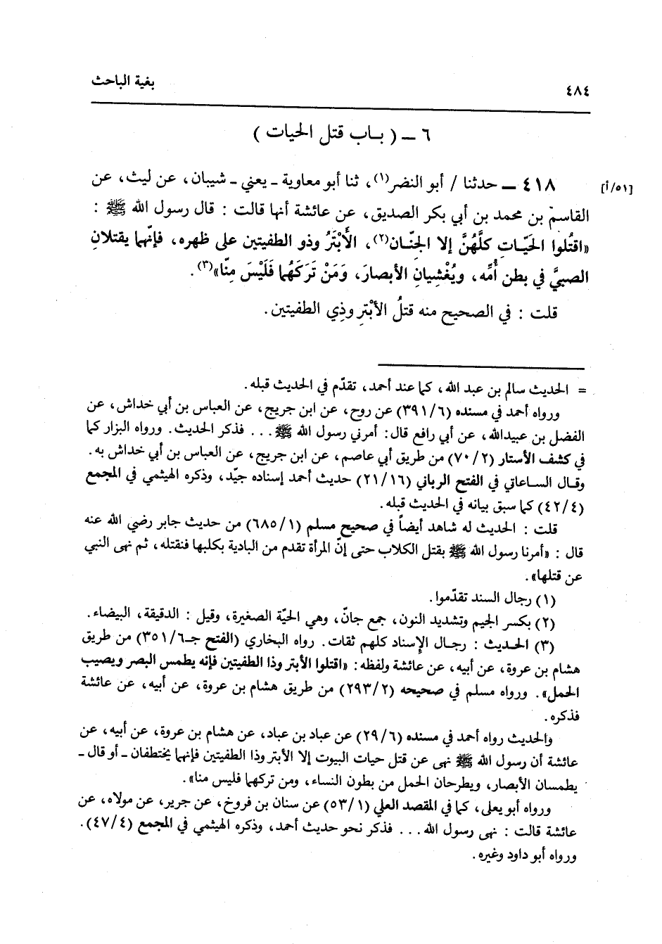 418 - حَدَّثَنَا أَبُو النَّضْرِ، ثنا أَبُو مُعَاوِيَةَ يَعْنِي شَيْبَانَ، عَنْ لَيْثٍ، عَنِ الْقَاسِمِ بْنِ مُحَمَّدِ بْنِ أَبِي بَكْرٍ الصِّدِّيقِ، عَنْ عَائِشَةَ أَنَّهَا قَالَتْ: قَالَ رَسُولُ اللَّهِ صَلَّى اللهُ عَلَيْهِ وَسَلَّمَ: «§اقْتُلُوا الْحَيَّاتِ كُلَّهِنَّ إِلَّا الْجِنَّانَ، الْأَبْتَرَ وَذَا الطُّفْيَتَيْنِ عَلَى ظَهْرِهِ فَإِنَّهُمَا يَقْتُلَانِ الصَّبِيَّ فِي بَطْنِ أُمِّهِ وَيُغَشِّيَانِ الْأَبْصَارَ وَمَنْ تَرَكَهُمَا فَلَيْسَ مِنَّا» قُلْتُ: فِي الصَّحِيحِ مِنْهُ قَتْلُ الْأَبْتَرِ وَذِي الطُّفْيَتَيْنِ
