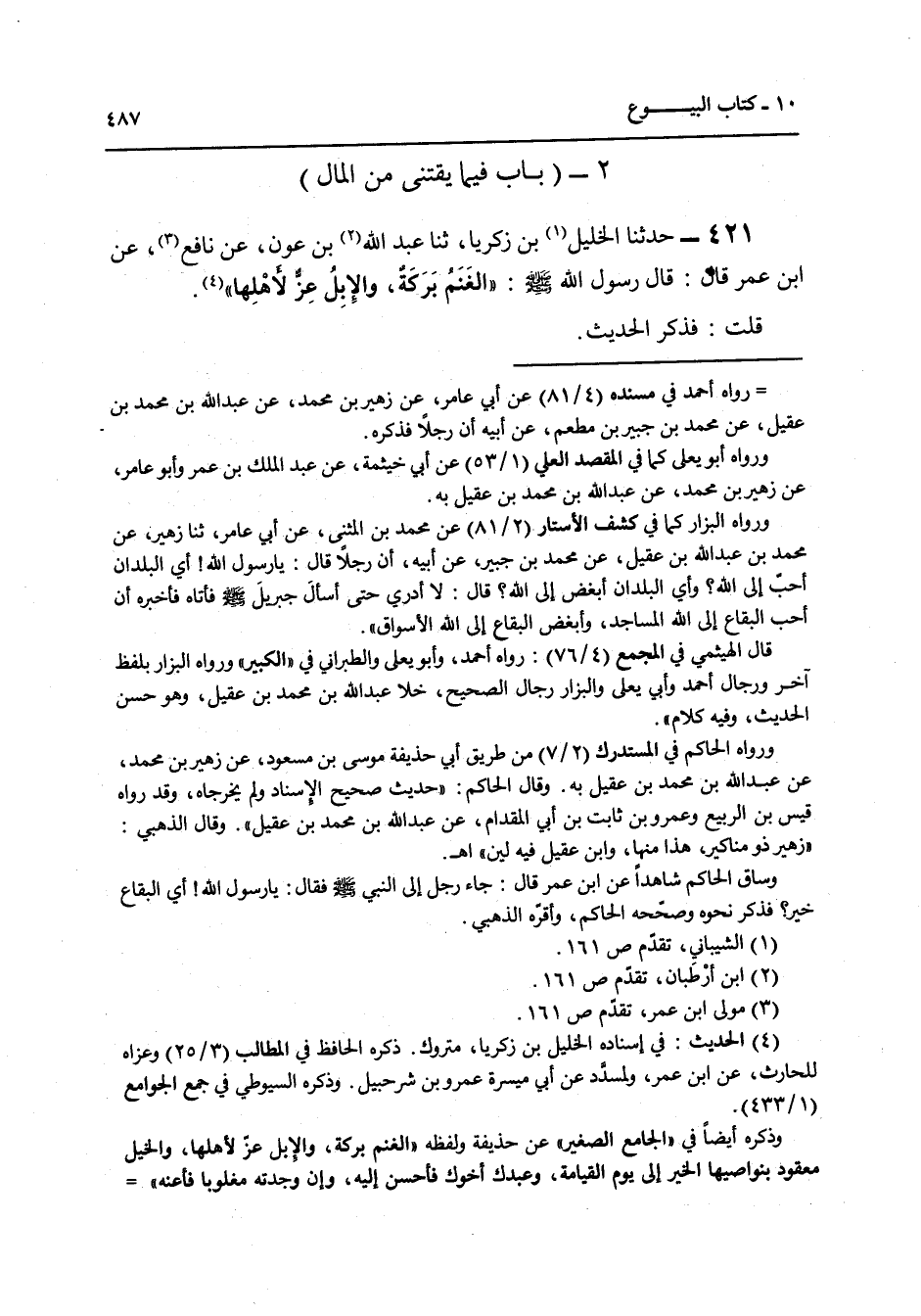 421 - حَدَّثَنَا الْخَلِيلُ بْنُ زَكَرِيَّا، ثنا عَبْدُ اللَّهِ بْنُ عَوْنٍ، عَنْ نَافِعٍ، عَنِ ابْنِ عُمَرَ قَالَ: قَالَ رَسُولُ اللَّهِ صَلَّى اللهُ عَلَيْهِ وَسَلَّمَ: «§الْغَنَمُ بَرَكَةٌ وَالْإِبِلُ عِزٌّ لِأَهْلِهَا» قُلْتُ: فَذَكَرَ الْحَدِيثَ