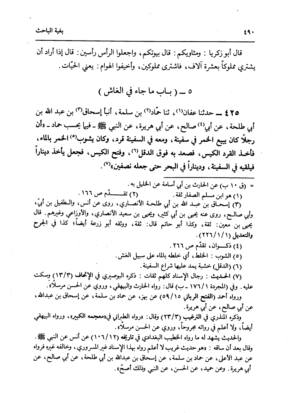 425 - حَدَّثَنَا عَفَّانُ، ثنا حَمَّادُ بْنُ سَلَمَةَ، أَنْبَأَ إِسْحَاقُ بْنُ عَبْدِ اللَّهِ بْنِ أَبِي طَلْحَةَ، عَنْ أَبِي صَالِحٍ، عَنْ أَبِي هُرَيْرَةَ عَنِ النَّبِيِّ صَلَّى اللهُ عَلَيْهِ وَسَلَّمَ فِيمَا يَحْسِبُ حَمَّادٌ أَنَّ «§رَجُلًا كَانَ يَبِيعُ الْخَمْرَ فِي سَفِينَةٍ وَمَعَهُ فِي السَّفِينَةِ قِرْدٌ , وَكَانَ يَشُوبُ الْخَمْرَ بِالْمَاءِ , فَأَخَذَ الْقِرْدُ الْكِيسَ فَصَعِدَ بِهِ فَوْقَ الدَّقَلِ وَفَتَحَ الْكِيسَ فَجَعَلَ يَأْخُذُ دِينَارًا فَيُلْقِيَهُ فِي السَّفِينَةِ وَدِينَارًا فِي الْبَحْرِ حَتَّى جَعَلَهُ نِصْفَيْنِ»