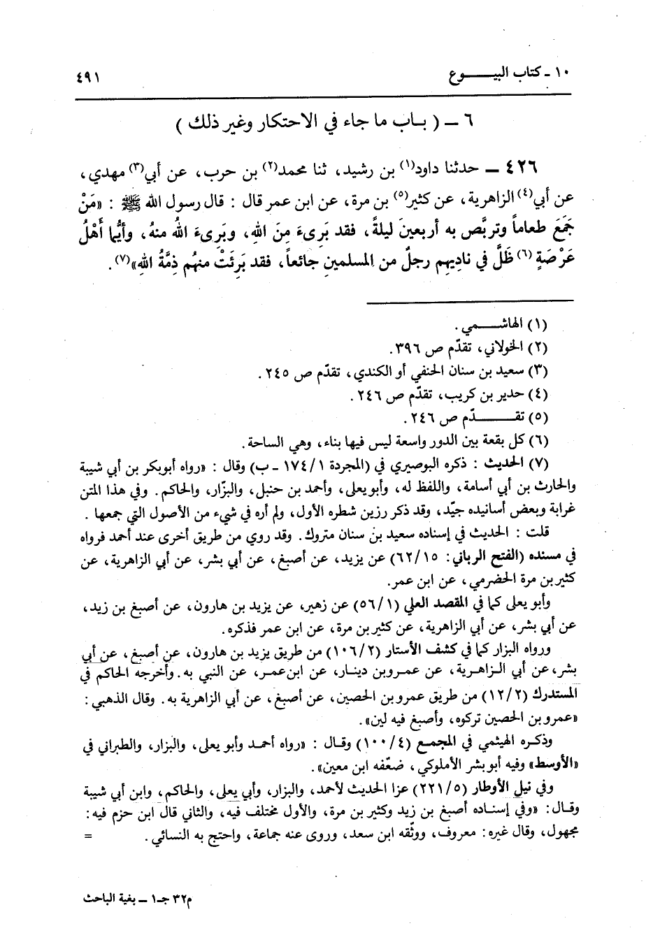 426 - حَدَّثَنَا دَاوُدُ بْنُ رُشَيْدٍ، ثنا مُحَمَّدُ بْنُ حَرْبٍ، عَنْ أَبِي مَهْدِيٍّ، عَنْ أَبِي الزَّاهِرِيَّةِ، عَنْ كَثِيرِ بْنِ مُرَّةَ، عَنِ ابْنِ عُمَرَ قَالَ: قَالَ رَسُولُ اللَّهِ صَلَّى اللهُ عَلَيْهِ وَسَلَّمَ: «§مَنْ جَمَعَ طَعَامًا وَتَرَبَّصَ بِهِ أَرْبَعِينَ لَيْلَةً فَقَدْ بَرِئَ مِنَ اللَّهِ وَبَرِئَ اللَّهُ مِنْهُ , وَأَيُّمَا أَهْلِ عَرْصَةٍ ظَلَّ فِي نَادِيهِمْ رَجُلٌ مِنَ الْمُسْلِمِينَ جَائِعًا فَقَدْ بَرِئَتْ مِنْهُمْ ذِمَّةُ اللَّهِ»