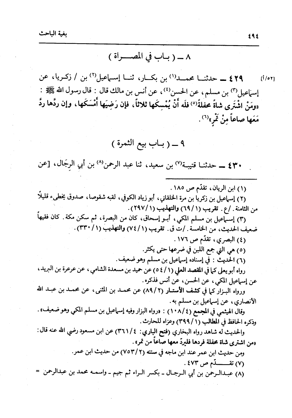 429 - حَدَّثَنَا مُحَمَّدُ بْنُ بَكَّارٍ، ثنا إِسْمَاعِيلُ بْنُ زَكَرِيَّا، عَنْ إِسْمَاعِيلَ بْنِ مُسْلِمٍ، عَنِ الْحَسَنِ، عَنْ أَنَسِ بْنِ مَالِكٍ قَالَ: قَالَ رَسُولُ اللَّهِ صَلَّى اللهُ عَلَيْهِ وَسَلَّمَ: «§وَمَنِ اشْتَرَى شَاةً مُحَفَّلَةً فَلَهُ أَنْ يُمْسِكَهَا ثَلَاثًا , فَإِنْ رَضِيَهَا أَمْسَكَهَا وَإِنْ رَدَّهَا رَدَّ مَعَهَا صَاعًا مِنْ تَمْرٍ»