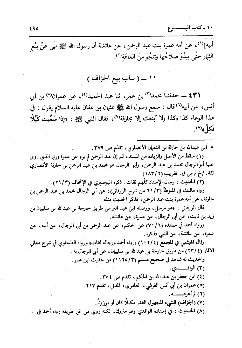 431 - حَدَّثَنَا مُحَمَّدُ بْنُ عُمَرَ، ثنا عَبْدُ الْحَمِيدِ، عَنْ عِمْرَانَ بْنِ أَبِي أَنَسٍ، عَنْ أَبِيهِ قَالَ: سَمِعَ رَسُولُ اللَّهِ صَلَّى اللهُ عَلَيْهِ وَسَلَّمَ عُثْمَانَ بْنَ عَفَّانَ عَلَيْهِ السَّلَامُ يَقُولُ: فِي هَذَا الْوِعَاءِ كَذَا وَكَذَا وَلَا أَبْتَعُكَ إِلَّا مُجَازَفَةً , فَقَالَ النَّبِيُّ صَلَّى اللهُ عَلَيْهِ وَسَلَّمَ: «§إِذَا سَمَّيْتَ كَيْلًا فَكِلْ»