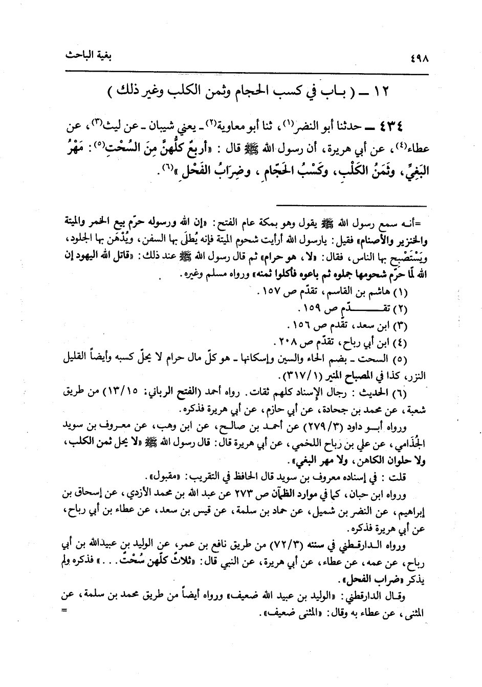 434 - حَدَّثَنَا أَبُو النَّضْرِ، ثنا أَبُو مُعَاوِيَةَ يَعْنِي شَيْبَانَ، عَنْ لَيْثٍ، عَنْ عَطَاءٍ، عَنْ أَبِي هُرَيْرَةَ أَنَّ رَسُولَ اللَّهِ صَلَّى اللهُ عَلَيْهِ وَسَلَّمَ قَالَ: " §أَرْبَعٌ كُلُّهُنَّ مِنَ السُّحْتِ: مَهْرُ الْبَغِيِّ وَثَمَنُ الْكَلْبِ وَكَسْبُ الْحَجَّامِ وَضِرَابُ الْفَحْلِ "