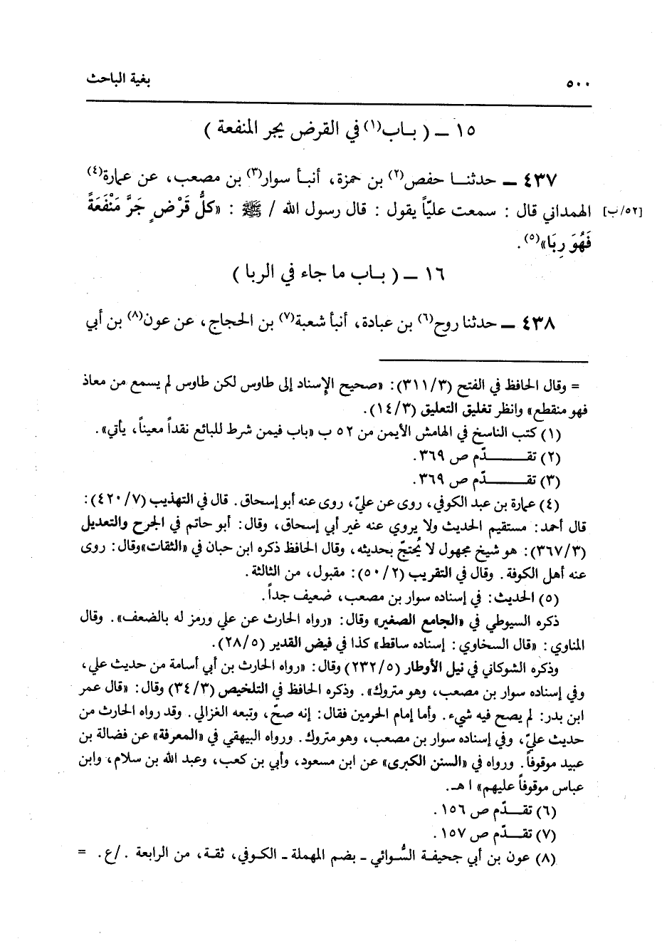 437 - حَدَّثَنَا حَفْصُ بْنُ حَمْزَةَ، أَنْبَأَ سَوَّارُ بْنُ مُصْعَبٍ، عَنْ عُمَارَةَ الْهَمْدَانِيِّ قَالَ: سَمِعْتُ عَلِيًّا يَقُولُ: قَالَ رَسُولُ اللَّهِ صَلَّى اللهُ عَلَيْهِ وَسَلَّمَ: «§كُلُّ قَرْضٍ جَرَّ مَنْفَعَةً فَهُوَ رِبًا»