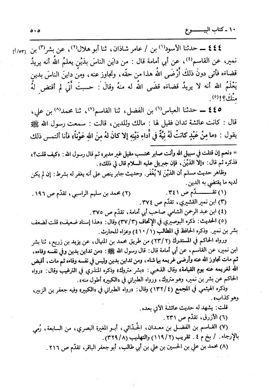 444 - حَدَّثَنَا الْأَسْوَدُ بْنُ عَامِرٍ شَاذَانُ , ثنا أَبُو هِلَالٍ، عَنْ بِشْرِ بْنِ نُمَيْرٍ، عَنِ الْقَاسِمِ، عَنْ أَبِي أُمَامَةَ قَالَ: " §مَنْ دَايَنَ النَّاسَ بِدَيْنٍ يَعْلَمُ اللَّهُ أَنَّهُ يُرِيدُ قَضَاءَهُ فَأَتَى دُونَ ذَلِكَ أَرْضَى اللَّهُ هَذَا مِنْ حَقِّهِ وَتَجَاوَزَ عَنْهُ , وَمَنْ دَايَنَ النَّاسَ بِدَيْنٍ يَعْلَمُ اللَّهُ أَنَّهُ لَا يُرِيدُ قَضَاءَهُ قَضَى اللَّهُ لَهُ مِنْهُ، وَقَالَ: حَسِبْتُ أَنِّي لَمْ أَقْتَضِ لَهُ مِنْكَ "