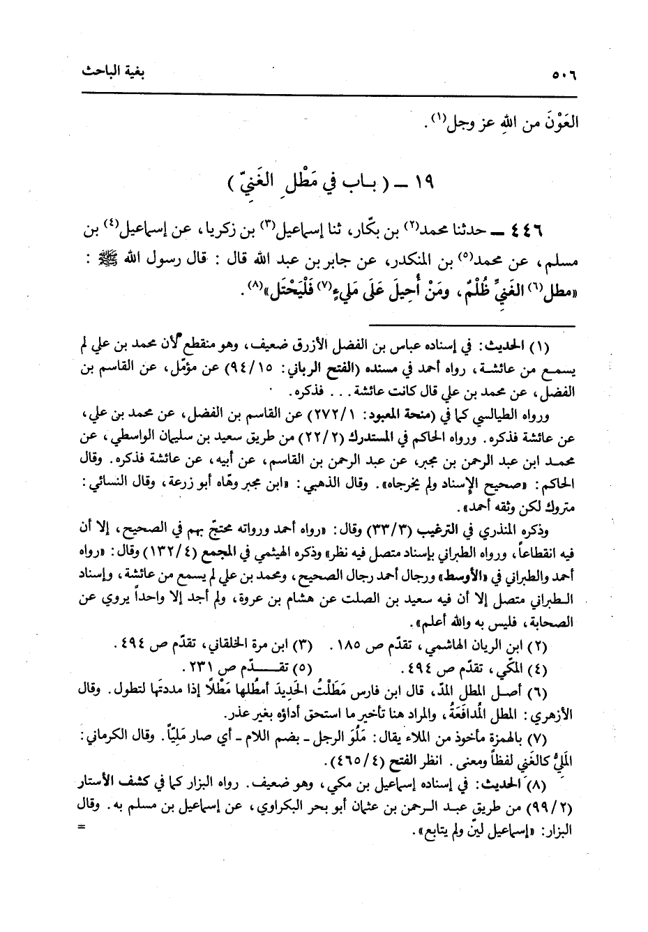 446 - حَدَّثَنَا مُحَمَّدُ بْنُ بَكَّارٍ، ثنا إِسْمَاعِيلُ بْنُ زَكَرِيَّا، عَنْ إِسْمَاعِيلَ بْنِ مُسْلِمٍ، عَنْ مُحَمَّدِ بْنِ الْمُنْكَدِرِ، عَنْ جَابِرِ بْنِ عَبْدِ اللَّهِ قَالَ: قَالَ رَسُولُ اللَّهِ صَلَّى اللهُ عَلَيْهِ وَسَلَّمَ: «§مَطْلُ الْغَنِيِّ ظُلْمٌ وَمَنْ أُحِيلَ عَلَى مَلِيءٍ فَلْيَحْتَلْ»