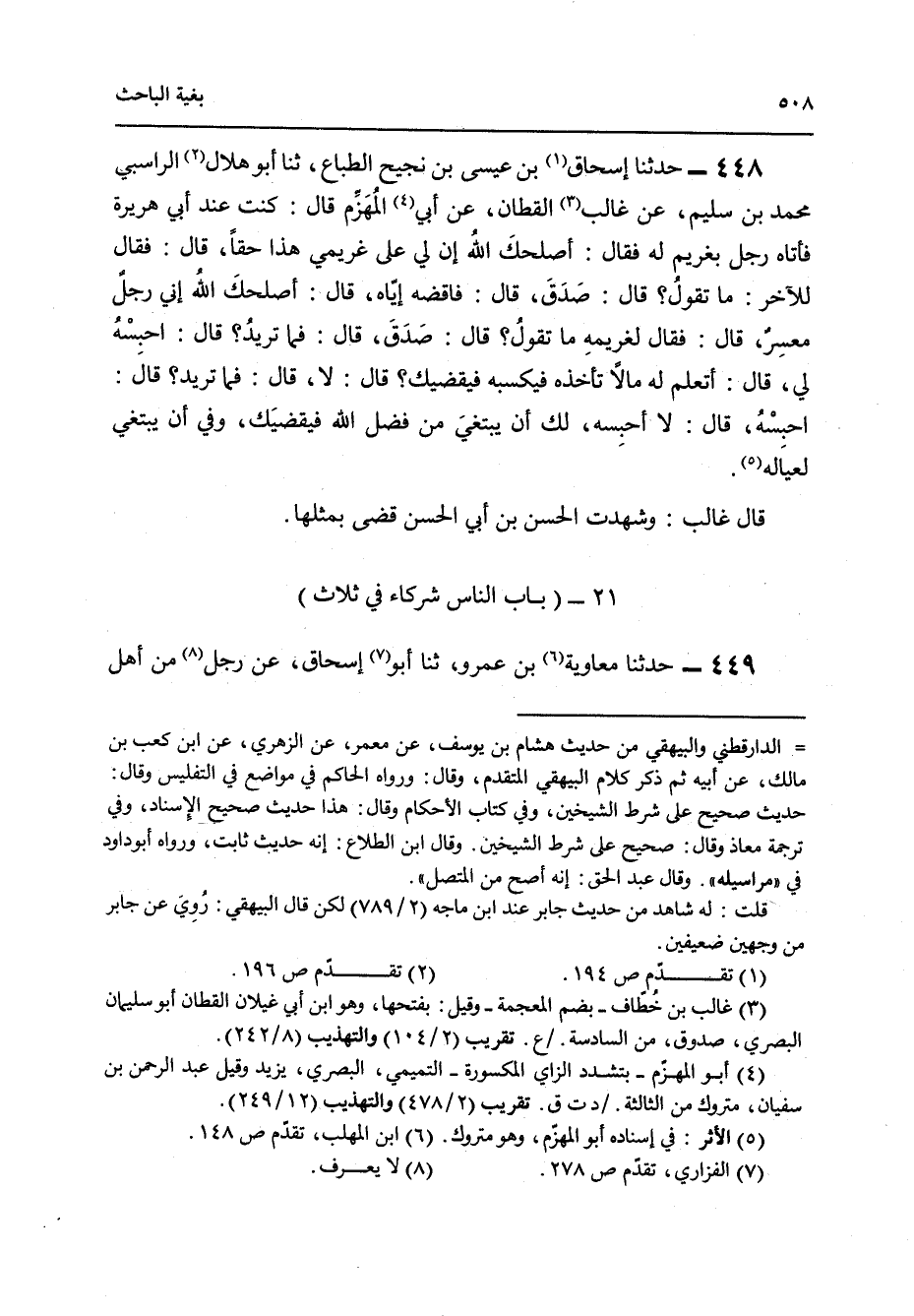 448 - حَدَّثَنَا إِسْحَاقُ بْنُ عِيسَى بْنِ نَجِيحٍ الطَّبَّاعُ، ثنا أَبُو هِلَالٍ الرَّاسِبِيُّ مُحَمَّدُ بْنُ سُلَيْمً , عَنْ غَالِبٍ الْقَطَّانِ، عَنْ أَبِي الْمُهَزِّمِ قَالَ: كُنْتُ عِنْدَ أَبِي هُرَيْرَةَ فَأَتَاهُ رَجُلٌ بِغَرِيمٍ لَهُ فَقَالَ: " أَصْلَحَكَ اللَّهُ، إِنَّ §لِي عَلَى غَرِيمِي هَذَا حَقًّا، قَالَ: فَقَالَ لِلْآخَرِ مَا تَقُولُ قَالَ: صَدَقَ قَالَ: فَاقْضِهِ إِيَّاهُ قَالَ: أَصْلَحَكَ اللَّهُ إِنِّي رَجُلٌ مُعْسِرٌ قَالَ: فَقَالَ لِغَرِيمِهِ: مَا تَقُولُ؟ قَالَ: صَدَقَ قَالَ: فَمَا تُرِيدُ؟ قَالَ: احْبِسْهُ لِي قَالَ: أَتَعْلَمُ لَهُ مَالًا تَأْخُذُهُ فَيَكْسِبُهُ فَيَقْضِيكَ؟ قَالَ: لَا , قَالَ: فَمَا تُرِيدُ قَالَ: احْبِسْهُ قَالَ: لَا أَحْبِسُهُ لَكَ أَنْ يَبْتَغِيَ مِنْ فَضْلِ اللَّهِ فَيَقْضِيَكَ وَفِي أَنْ يَبْتَغِيَ لِعِيَالِهِ " قَالَ: غَالِبٌ , وَشَهِدْتُ الْحَسَنَ بْنَ أَبِي الْحَسَنِ قَضَى بِمِثْلِهَا