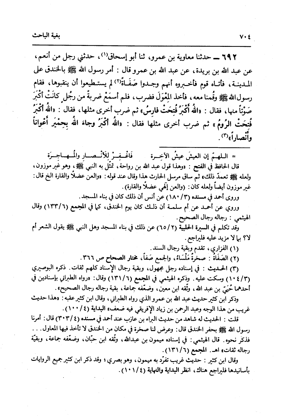 692 - حَدَّثَنَا مُعَاوِيَةُ بْنُ عَمْرٍو , ثنا أَبُو إِسْحَاقَ , حَدَّثَنِي رَجُلٌ مِنْ أَنْعَمَ , عَنْ عَبْدِ اللَّهِ بْنِ بُرَيْدَةَ , عَنْ عَبْدِ اللَّهِ بْنِ عَمْرٍو قَالَ: أَمَرَ رَسُولُ اللَّهِ صَلَّى اللهُ عَلَيْهِ وَسَلَّمَ بِالْخَنْدَقِ عَلَى الْمَدِينَةِ , فَأَتَاهُ قَوْمٌ فَأَخْبَرُوهُ أَنَّهُمْ وَجَدُوا صَفَاةً لَمْ يَسْتَطِيعُوا أَنْ يُنَقِّبُوهَا , فَقَامَ رَسُولُ اللَّهِ صَلَّى اللهُ عَلَيْهِ وَسَلَّمَ وَقُمْنَا مَعَهُ , فَأَخَذَ الْمِعْوَلَ فَضَرَبَ , فَلَمْ أَسْمَعْ ضَرْبَةً مِنْ رَجُلٍ كَانَتْ أَكْبَرَ صَوْتًا مِنْهَا , فَقَالَ: «§اللَّهُ أَكْبَرُ , فُتِحَتْ فَارِسُ» , ثُمَّ ضَرَبَ أُخْرَى مِثْلَهَا فَقَالَ: «اللَّهُ أَكْبَرُ , فُتِحَتِ الرُّومُ» , ثُمَّ ضَرَبَ أُخْرَى مِثْلَهَا فَقَالَ: «اللَّهُ أَكْبَرُ , وَجَاءَ اللَّهُ بِحِمْيَرَ أَعْوَانًا وَأَنْصَارًا»