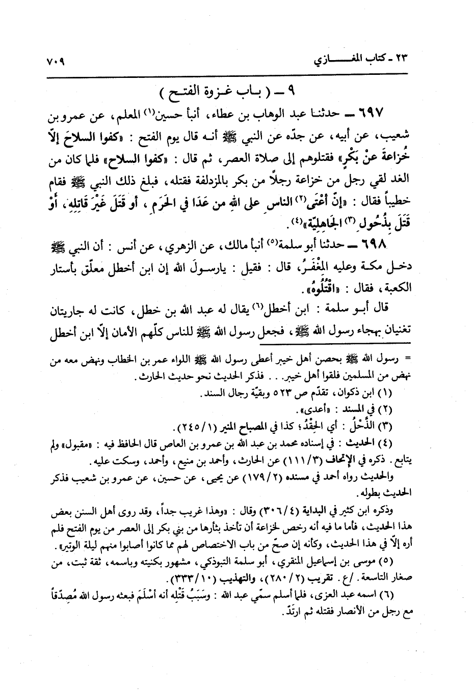 697 - حَدَّثَنَا عَبْدُ الْوَهَّابِ بْنُ عَطَاءٍ , أَنْبَأَ حُسَيْنٌ الْمُعَلِّمُ , عَنْ عَمْرِو بْنِ شُعَيْبٍ , عَنْ أَبِيهِ , عَنْ جَدِّهِ , عَنِ النَّبِيِّ صَلَّى اللهُ عَلَيْهِ وَسَلَّمَ أَنَّهُ قَالَ يَوْمَ الْفَتْحِ: «§كُفُّوا السِّلَاحَ إِلَّا خُزَاعَةَ عَنْ بَكْرٍ» , فَقَتَلُوهُمْ إِلَى صَلَاةِ الْعَصْرِ ثُمَّ قَالَ: " كُفُّوا السِّلَاحَ , فَلَمَّا كَانَ مِنَ الْغَدِ لَقِيَ رَجُلٌ مِنْ خُزَاعَةَ رَجُلًا مِنْ بَكْرٍ بِالْمُزْدَلِفَةِ فَقَتَلَهُ , فَبَلَغَ ذَلِكَ النَّبِيَّ صَلَّى اللهُ عَلَيْهِ وَسَلَّمَ فَقَامَ خَطِيبًا فَقَالَ: «إِنَّ أَعْتَى النَّاسِ عَلَى اللَّهِ مَنْ عَدَا فِي الْحَرَمِ أَوْ قَتَلَ غَيْرَ قَاتَلِهِ أَوْ قَتَلَ بِذُحُولِ الْجَاهِلِيَّةِ»