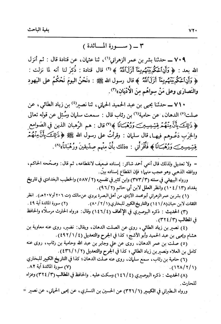 710 - حَدَّثَنَا يَحْيَى بْنُ عَبْدِ الْحَمِيدِ الْحِمَّانِيُّ , ثنا نُصَيْرُ بْنُ زِيَادٍ الطَّائِيُّ , عَنْ صَلَّتٍ الدَّهَّانِ , عَنْ حَامِيَةَ بْنِ رِئَابٍ قَالَ: سَمِعْتُ سَلْمَانَ , وَسُئِلَ , عَنْ قَوْلِهِ تَعَالَى {ذَلِكَ بِأَنَّ مِنْهُمْ قِسِّيسِينَ وَرُهْبَانًا} [المائدة: 82] قَالَ: هُمُ الرُّهْبَانُ الَّذِينَ فِي الصَّوَامِعِ وَالْخِرَبِ دَعُوهُمْ فِيهَا , قَالَ سَلْمَانُ: وَقَرَأْتُ عَلَى رَسُولِ اللَّهِ صَلَّى اللهُ عَلَيْهِ وَسَلَّمَ " {§ذَلِكَ بِأَنَّ مِنْهُمْ قِسِّيسِينَ وَرُهْبَانًا} [المائدة: 82] فَأَقْرَأَنِي: «ذَلِكَ بِأَنَّ مِنْهُمْ صِدِّيقِينَ وَرُهْبَانًا»