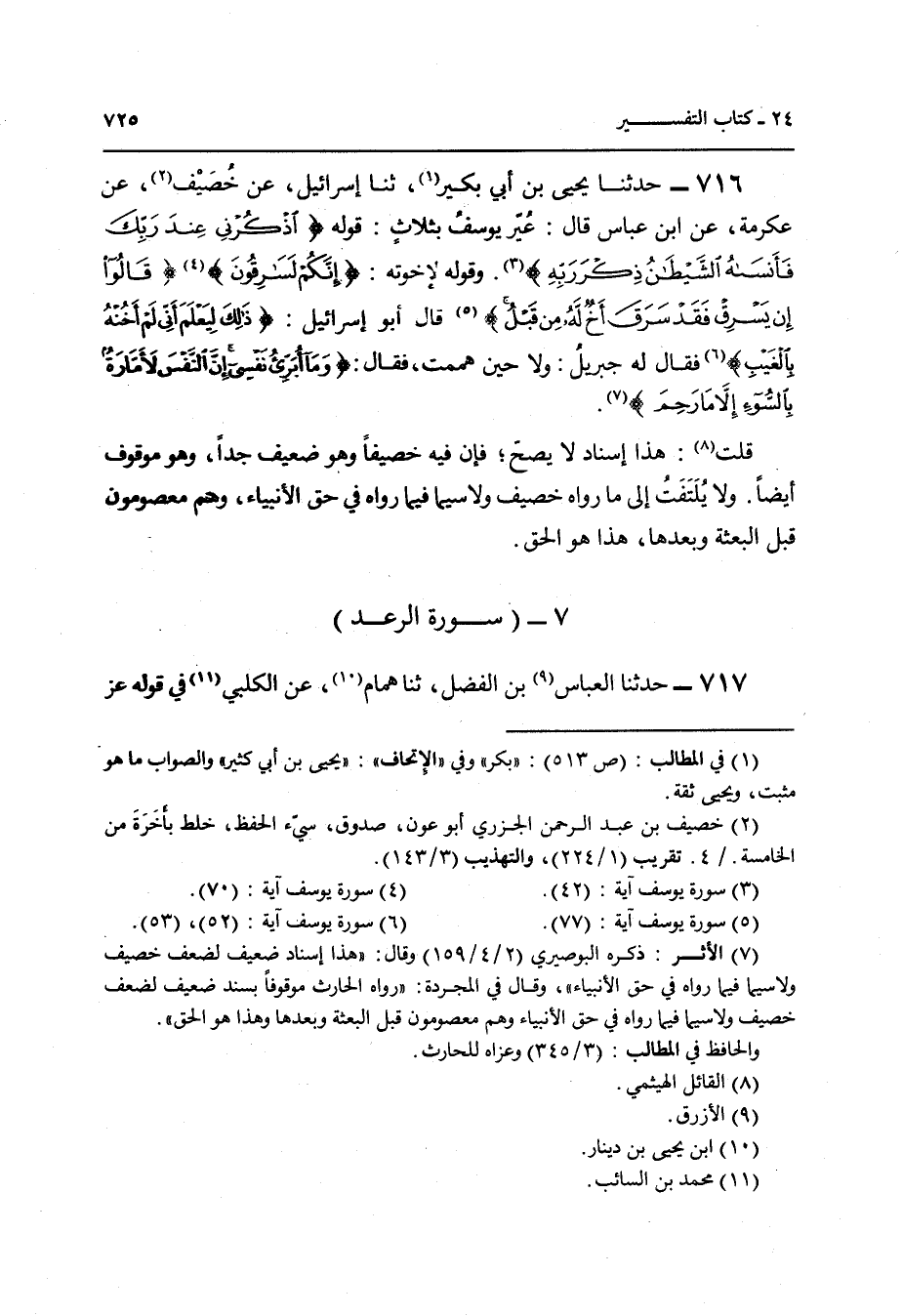 716 - حَدَّثَنَا يَحْيَى بْنُ أَبِي بُكَيْرٍ , ثَنَا إِسْرَائِيلُ , عَنْ خُصَيْفٍ , عَنْ عِكْرِمَةَ , عَنِ ابْنِ عَبَّاسٍ قَالَ: " §عُيِّرَ يُوسُفُ بِثَلَاثٍ: قَوْلِهِ {اذْكُرْنِي عِنْدَ رَبِّكَ فَأَنْسَاهُ الشَّيْطَانُ ذِكْرَ رَبِّهِ} [يوسف: 42] وَقَوْلِهِ لِإِخْوَتِهِ {إِنَّكُمْ لَسَارِقُونَ} [يوسف: 70] , {قَالُوا إِنْ يَسْرِقْ فَقَدْ سَرَقَ أَخٌ لَهُ مِنْ قَبْلُ} [يوسف: 77] قَالَ أَبُو إِسْرَائِيلَ: {ذَلِكَ لِيَعْلَمَ أَنِّي لَمْ أَخُنْهُ بِالْغَيْبِ} [يوسف: 52] فَقَالَ لَهُ جِبْرِيلُ: وَلَا حِينَ هَمَمْتَ فَقَالَ: {وَمَا أُبَرِّئُ نَفْسِي إِنَّ النَّفْسَ لَأَمَّارَةٌ بِالسُّوءِ إِلَّا مَا رَحِمَ رَبِّي} [يوسف: 53] " قُلْتُ: هَذَا إِسْنَادٌ لَا يَصِحُّ , فَإِنَّ فِيهِ خُصَيْفًا وَهُوَ ضَعِيفٌ جِدًّا , وَهُوَ مَوْقُوفٌ أَيْضًا , وَلَا يُلْتَفَتُ إِلَى مَا رَوَاهُ خُصَيْفٌ , وَلَا سِيَّمَا فِيمَا رَوَاهُ فِي حَقِّ الْأَنْبِيَاءِ وَهُمْ مَعْصُومُونَ قَبْلَ الْبَعْثَةِ وَبَعْدَهَا , هَذَا هُوَ الْحَقُّ