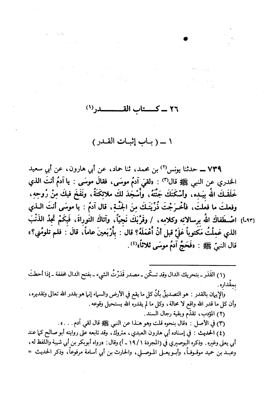 739 - حَدَّثَنَا يُونُسُ بْنُ مُحَمَّدٍ , ثنا حَمَّادٌ , عَنْ أَبِي هَارُونَ , عَنْ أَبِي سَعِيدٍ الْخُدْرِيِّ عَنِ النَّبِيِّ صَلَّى اللهُ عَلَيْهِ وَسَلَّمَ قَالَ: " §لَقِيَ آدَمُ مُوسَى فَقَالَ مُوسَى: يَا آدَمُ أَنْتَ الَّذِي خَلَقَكَ اللَّهُ بِيَدِهِ وَأَسْكَنَكَ جَنَّتَهُ وَأَسْجَدَ لَكَ مَلَائِكَتَهُ وَنَفَخَ فِيكَ مِنْ رُوحِهِ وَفَعَلْتَ مَا فَعَلْتَ فَأَخْرَجْتَ ذُرِّيَّتَكَ مِنَ الْجَنَّةِ , قَالَ آدَمُ: يَا مُوسَى أَنْتَ الَّذِي اصْطَفَاكَ اللَّهُ بِرِسَالَاتِهِ وَكَلَامِهِ وَقَرَّبَكَ نَجِيًّا وآتاكَ التَّوْرَاةَ فَبِكَمْ تَجِدُ الذَّنْبَ الَّذِي عَمِلْتُ مَكْتُوبًا عَلَيَّ قَبْلَ أَنْ أَعْمَلَهُ؟ قَالَ: بِأَرْبَعِينَ عَامًا قَالَ: فَلِمَ تَلُومُنِي؟ قَالَ النَّبِيُّ صَلَّى اللهُ عَلَيْهِ وَسَلَّمَ: «فَحَجَّ آدَمُ مُوسَى ثَلَاثًا» وَقَالَ فِي رِوَايَةٍ عَنِ الْحَسَنِ , وَقَالَ بِنَحْوِهِ وَهِيَ مُرْسَلَةٌ فَقَالَ: أَنَا أَقْدَمُ أَمُ الذِّكْرُ , ثُمَّ ذَكَرَ بَعْدَ هَذَا بِالسِّنْدِ الَّذِي ذَكَرْتُهُ عَنْ أَبِي سَعِيدٍ الْخُدْرِيِّ عَنِ النَّبِيِّ صَلَّى اللهُ عَلَيْهِ وَسَلَّمَ قَالَ بِمِثْلِهِ غَيْرَ أَنَّهُ قَالَ: " يَا مُوسَى أَرَأَيْتَ مَا عَلِمَ اللَّهُ أَنَّهُ يَكُونُ بُدٌّ مِنْ أَنْ يَكُونَ , قَالَ: فَحَجَّ آدَمُ مُوسَى فَحَجَّ آدَمُ مُوسَى "