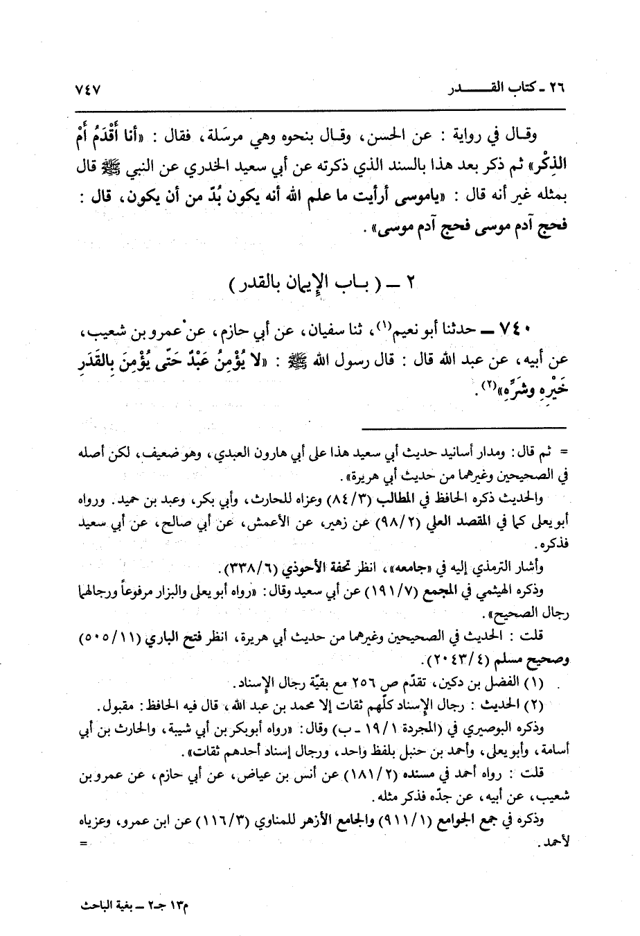 740 - حَدَّثَنَا أَبُو نُعَيْمٍ , ثنا سُفْيَانُ , عَنْ أَبِي حَازِمٍ , عَنْ عَمْرِو بْنِ شُعَيْبٍ , عَنْ أَبِيهِ , عَنْ عَبْدِ اللَّهِ قَالَ: قَالَ رَسُولُ اللَّهِ صَلَّى اللهُ عَلَيْهِ وَسَلَّمَ: «§لَا يُؤْمِنُ عَبْدٌ حَتَّى يُؤْمِنَ بِالْقَدَرِ خَيْرِهِ وَشَرِّهِ»