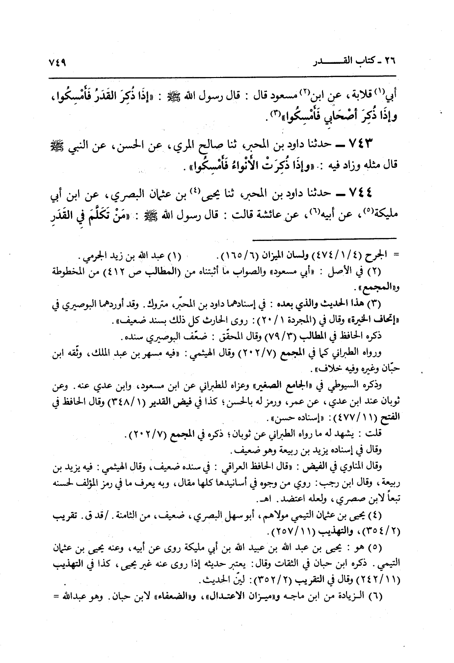 744 - حَدَّثَنَا دَاوُدُ بْنُ الْمُحَبَّرِ , ثَنَا يَحْيَى بْنُ عُثْمَانَ الْبَصْرِيُّ , عَنِ ابْنِ أَبِي مُلَيْكَةَ , عَنْ أَبِيهِ , عَنْ عَائِشَةَ قَالَتْ: قَالَ رَسُولُ اللَّهِ صَلَّى اللهُ عَلَيْهِ وَسَلَّمَ: «§مَنْ تَكَلَّمَ فِي الْقَدَرِ بِشَيْءٍ سُئِلَ عَنْهُ يَوْمَ الْقِيَامَةِ»