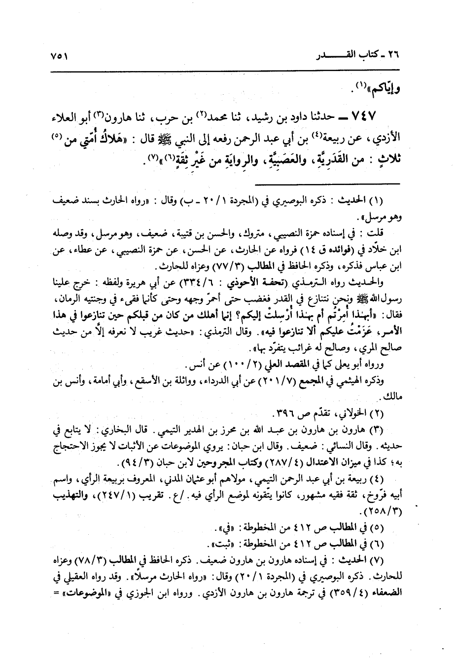 747 - حَدَّثَنَا دَاوُدُ بْنُ رُشَيْدٍ , ثنا مُحَمَّدُ بْنُ حَرْبٍ , ثنا هَارُونُ أَبُو الْعَلَاءِ الْأَزْدِيُّ , عَنْ رَبِيعَةَ بْنِ أَبِي عَبْدِ الرَّحْمَنِ رَفَعَهُ إِلَى النَّبِيِّ صَلَّى اللهُ عَلَيْهِ وَسَلَّمَ قَالَ: " §هَلَاكُ أُمَّتِي مِنْ ثَلَاثٍ: مِنَ الْقَدَرِيَّةِ وَالْعَصَبِيَّةِ وَالرِّوَايَةِ مِنْ غَيْرِ ثِقَةٍ "