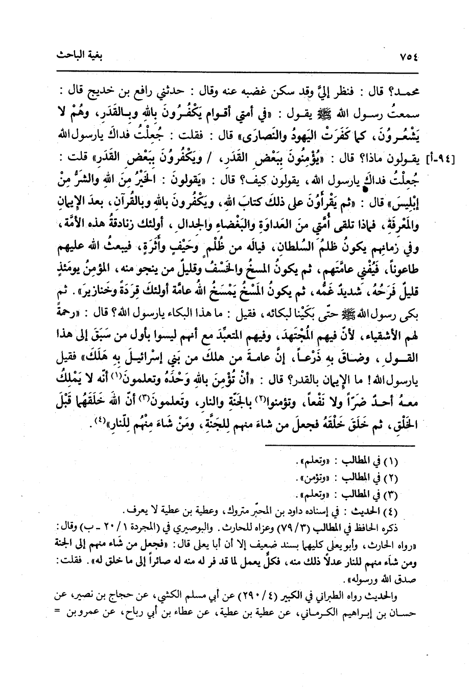 قَالَ: يَقُولُونَ الْخَيْرُ مِنَ الله, وَالشَّرُّ مِنْ إِبْلِيسَ، قَالَ: ثُمَّ يَقْرَأُونَ عَلَى ذَلِكَ كِتَابَ الله, وَيَكْفُرُونَ بِالله وَبِالْقُرَآنِ بَعْدَ الإِيمَانِ وَالْمَعْرِفَةِ، فَمَاذَا تَلْقَى أُمَّتِي مِنَ الْعَدَاوَةِ وَالْبَغْضَاءِ وَالْجِدَالِ, أُولَئِكَ زَنَادِقَةُ هَذِهِ الأُمَّةِ، وَفِي زَمَانِهِمْ يَكُونُ ظُلْمُ السُّلْطَانِ, فَيَالَهُ مِنْ ظُلْمٍ وَحَيْفٍ وَأَثَرَةٍ، فَيَبْعَثُ الله عَلَيْهِمْ طَاعُونًا، فَيُفْنِي عَامَّتَهُمْ, ثُمَّ يَكُونُ الْمَسْخُ, وَالْخَسْفُ، وَقَلِيلٌ مَنْ يَنْجُو مِنْهُ، الْمُؤْمِنُ يَوْمَئِذٍ قَلِيلٌ فَرَحُهُ, شَدِيدٌ غَمُّهُ، ثُمَّ يَكُونُ الْمَسْخُ, يَمْسَخُ الله عَامَّةَ أُولَئِكَ قِرَدَةً وَخَنَازِيرَ، ثُمَّ بَكَى رَسُولُ الله صَلى الله عَلَيه وَسَلمَ, حَتَّى بَكَيْنَا لِبُكَائِهِ، فَقِيلَ: مَا هَذَا الْبُكَاءُ يَا رَسُولَ الله؟ قَالَ: رَحْمَةً لَهُمُ الأَشْقِيَاءِ؛ لإِنَّ فِيهِمُ الْمُجْتَهِدُ, وَفِيهِمُ الْمُتَعَبِّدُ, مَعَ أَنَّهُمْ لَيْسُوا بِأَوَّلَ مَنْ سَبَقَ إِلَى هَذَا الْقَوْلِ وَضَاقَ بِهِ ذَرْعًا، إِنَّ عَامَّةَ مَنْ هَلَكَ مِنْ بَنِي إِسْرَائِيلَ بِهِ هَلَكَ، فَقِيلَ: يَا رَسُولَ الله، مَا الإِيمَانُ بِالْقَدَرِ؟ قَالَ: أَنْ تُؤْمِنَ بِالله وَحْدَهُ, وَتَعْلَمُونَ أَنَّهُ لاَ يَمْلِكُ مَعَهُ أَحَدٌ ضَرًّا وَلاَ نَفْعًا، وَتُؤْمِنُوا بِالْجَنَّةِ وَالنَّارِ, وَتَعْلَمُونَ أَنَّ الله خَلَقَهُمَا قَبْلَ الْخَلْقِ, ثُمَّ خَلَقَ خَلْقَهُ, فَجَعَلَ مَنْ شَاءَ مِنْهُمْ لِلْجَنَّةِ, وَمَنْ شَاءَ مِنْهُمْ لِلنَّارِ.
