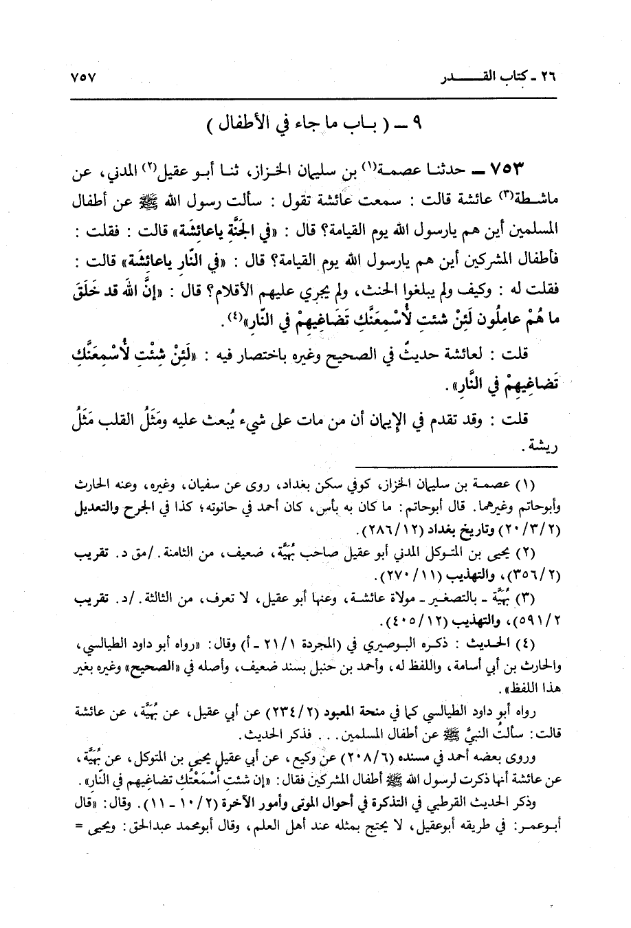753 - حَدَّثَنَا عِصْمَةُ بْنُ سُلَيْمَانَ الْخَزَّازُ , ثنا أَبُو عَقِيلٍ الْمَدَنِيُّ , عَنْ مَاشِطَةِ عَائِشَةَ قَالَتْ: سَمِعْتُ عَائِشَةَ تَقُولُ: سَأَلْتُ رَسُولَ اللَّهِ صَلَّى اللهُ عَلَيْهِ وَسَلَّمَ عَنْ أَطْفَالِ الْمُسْلِمِينَ: أَيْنَ هُمْ يَا رَسُولَ اللَّهِ يَوْمَ الْقِيَامَةِ؟ قَالَ: «§فِي الْجَنَّةِ يَا عَائِشَةُ» قَالَتْ: فَقُلْتُ: فَأَطْفَالُ الْمُشْرِكِينَ أَيْنَ هُمْ يَا رَسُولَ اللَّهِ يَوْمَ الْقِيَامَةِ؟ قَالَ: «فِي النَّارِ يَا عَائِشَةُ» قَالَتْ: فَقُلْتُ لَهُ وَكَيْفَ وَلَمْ يَبْلُغُوا الْحِنْثَ , وَلَمْ تَجْرِ عَلَيْهِمُ الْأَقْلَامُ؟ قَالَ: «إِنَّ اللَّهَ قَدْ خَلَقَ مَا هُمْ عَامِلُونَ لَئِنْ شِئْتِ لَأُسْمِعَنَّكِ تَضَاغِيَهُمْ فِي النَّارِ» , قُلْتُ: لِعَائِشَةَ حَدِيثٌ فِي الصَّحِيحِ وَغَيْرِهِ بِاخْتِصَارٍ فِيهِ: «لَئِنْ شِئْتِ لَأُسْمِعَنَّكِ تَضَاغِيَهُمْ فِي النَّارِ» , قُلْتُ: وَقَدْ تَقَدَّمَ فِي الْإِيمَانِ أَنَّ مَنْ مَاتَ عَلَى شَيْءٍ يُبْعَثُ عَلَيْهِ , وَمَثَلُ الْقَلْبِ مَثَلُ رِيشَةٍ