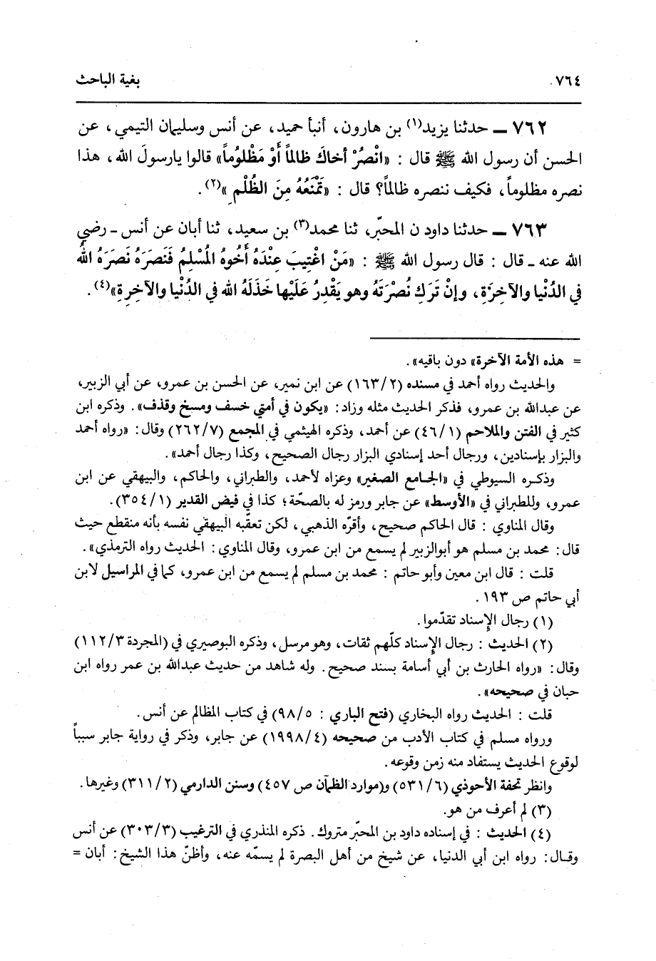 762 - حَدَّثَنَا يَزِيدُ بْنُ هَارُونَ , أنبأ حُمَيْدٌ , عَنْ أَنَسٍ , وَسُلَيْمَانُ التَّيْمِيُّ , عَنِ الْحَسَنِ , أَنَّ رَسُولَ اللَّهِ صَلَّى اللهُ عَلَيْهِ وَسَلَّمَ قَالَ: «§انْصُرْ أَخَاكَ ظَالِمًا أَوْ مَظْلُومًا» , قَالُوا: يَا رَسُولَ اللَّهِ هَذَا نَنْصُرُهُ مَظْلُومًا , فَكَيْفَ نَنْصُرُهُ ظَالِمًا؟ قَالَ: «تَمْنَعُهُ مِنَ الظُّلْمِ»