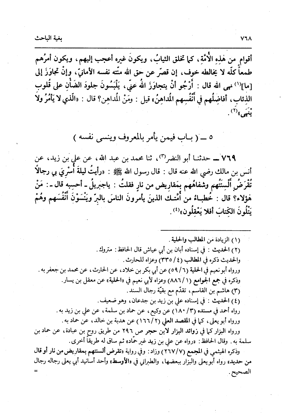 769 - حَدَّثَنَا أَبُو النَّضْرِ , ثنا مُحَمَّدُ بْنُ عَبْدِ اللَّهِ , عَنْ عَلِيِّ بْنِ زَيْدٍ , عَنْ أَنَسِ بْنِ مَالِكٍ رَضِيَ اللَّهُ عَنْهُ قَالَ: قَالَ رَسُولُ اللَّهِ صَلَّى اللهُ عَلَيْهِ وَسَلَّمَ: " §رَأَيْتُ لَيْلَةَ أُسْرِيَ بِي رِجَالًا تُقْرَضُ أَلْسِنَتُهُمْ وَشِفَاهُهُمْ بِمَقَارِيضَ مِنْ نَارٍ فَقُلْتُ: يَا جِبْرِيلُ - أَحْسِبُهُ قَالَ: - مَنْ هَؤُلَاءِ قَالَ: خُطَبَاءُ مِنْ أُمَّتِكَ الَّذِينَ يَأْمُرُونَ النَّاسَ بِالْبِرِّ وَيَنْسَوْنَ أَنْفُسَهُمْ وَهُمْ يَتْلُونَ الْكِتَابَ أَفَلَا يَعْقِلُونَ "
