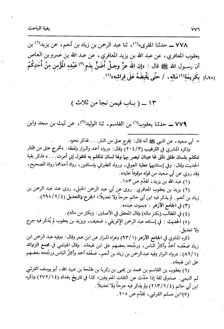 778 - حَدَّثَنَا الْمُقْرِئُ , ثنا عَبْدُ الرَّحْمَنِ بْنُ زِيَادِ بْنِ أَنْعَمَ , عَنْ يَزِيدَ بْنِ يَعْقُوبَ الْمَعَافِرِيِّ , عَنْ عَبْدِ اللَّهِ بْنِ يَزِيدَ الْمَعَافِرِيِّ , عَنْ عَبْدِ اللَّهِ بْنِ عَمْرِو بْنِ الْعَاصِ , أَنَّ رَسُولَ اللَّهِ صَلَّى اللهُ عَلَيْهِ وَسَلَّمَ قَالَ: إِنَّ «§اللَّهَ عَزَّ وَجَلَّ أَضَنُّ بِدَمِ عَبْدِهِ الْمُؤْمِنِ مِنْ أَحَدِكُمْ بِكَرِيمَةِ مَالِهِ حَتَّى يَقْبِضَهُ عَلَى فِرَاشِهِ»