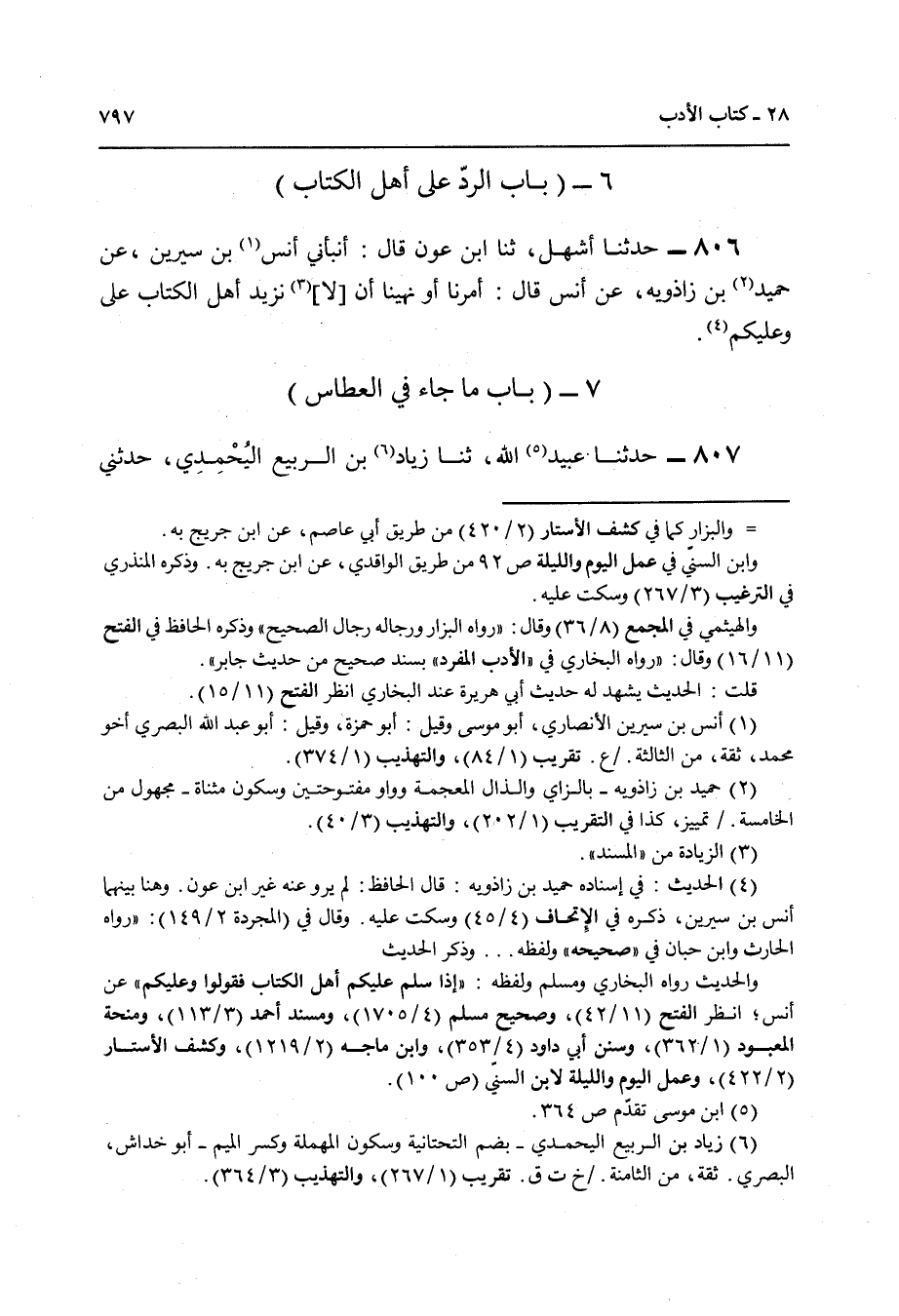 806 - حَدَّثَنَا أَشْهَلُ , ثَنَا ابْنُ عَوْنٍ قَالَ: أَنْبَأَنِي أَنَسُ بْنُ سِيرِينَ , عَنْ حُمَيْدِ بْنِ زَاذَوَيْهِ , عَنْ أَنَسٍ قَالَ: " §أُمِرْنَا أَوْ نُهِينَا أَنْ لَا نَزِيدَ أَهْلَ الْكِتَابِ عَلَى: وَعَلَيْكُمْ "
