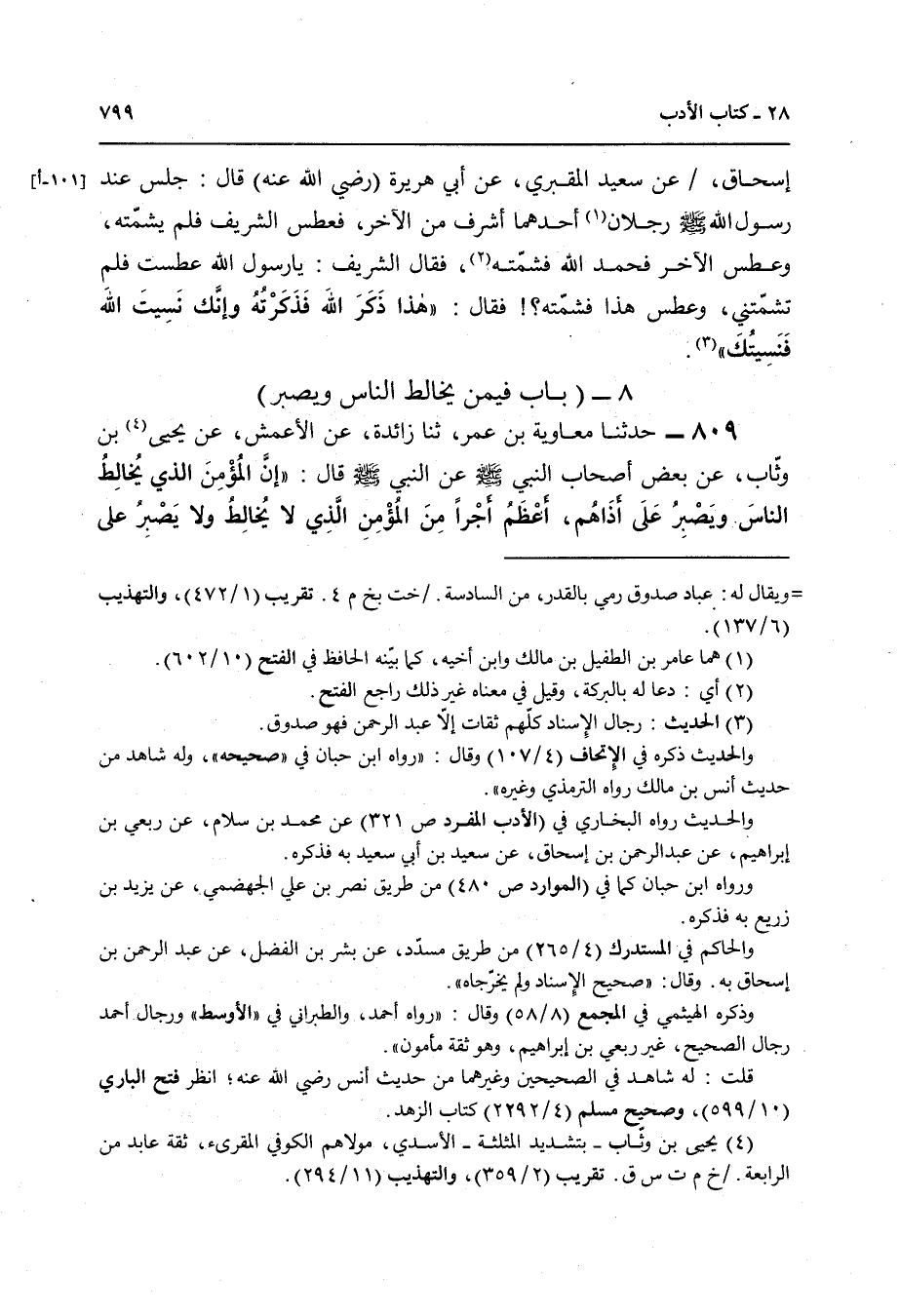 809 - حَدَّثَنَا مُعَاوِيَةُ بْنُ عُمَرَ , ثنا زَائِدَةُ , عَنِ الْأَعْمَشِ , عَنْ يَحْيَى بْنِ وَثَّابٍ , عَنْ بَعْضِ , أَصْحَابِ النَّبِيِّ صَلَّى اللهُ عَلَيْهِ وَسَلَّمَ , عَنِ النَّبِيِّ صَلَّى اللهُ عَلَيْهِ وَسَلَّمَ قَالَ: إِنَّ «§الْمُؤْمِنَ الَّذِي يُخَالِطُ النَّاسَ وَيَصْبِرُ عَلَى أَذَاهُمْ أَعْظَمُ أَجْرًا مِنَ الْمُؤْمِنِ الَّذِي لَا يُخَالِطُ وَلَا يَصْبِرُ عَلَى أَذَاهُمْ»