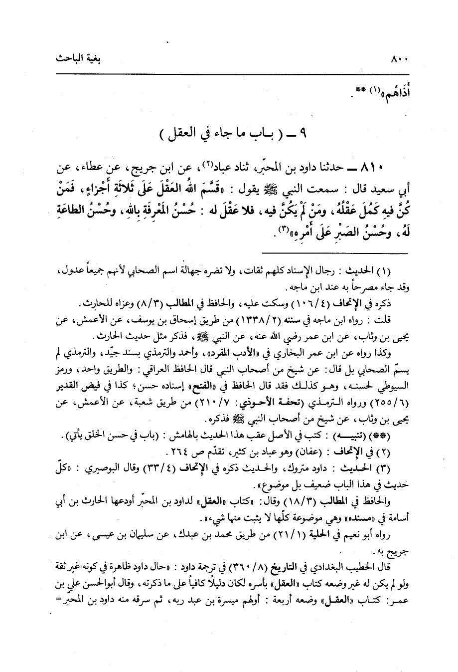810 - حَدَّثَنَا دَاوُدُ بْنُ الْمُحَبَّرِ , ثنا عَبَّادٌ , عَنِ ابْنِ جُرَيْجٍ , عَنْ عَطَاءٍ , عَنْ أَبِي سَعِيدٍ قَالَ: سَمِعْتُ النَّبِيَّ صَلَّى اللهُ عَلَيْهِ وَسَلَّمَ يَقُولُ: " §قَسَّمَ اللَّهُ الْعَقْلَ عَلَى ثَلَاثَةِ أَجْزَاءٍ فَمَنْ كُنَّ فِيهِ كَمُلَ عَقْلُهُ , وَمَنْ لَمْ يَكُنَّ فِيهِ فَلَا عَقْلَ لَهُ: حُسْنُ الْمَعْرِفَةِ بِاللَّهِ وَحُسْنُ الطَّاعَةِ لَهُ وَحُسْنُ الصَّبْرِ عَلَى أَمْرِهِ "