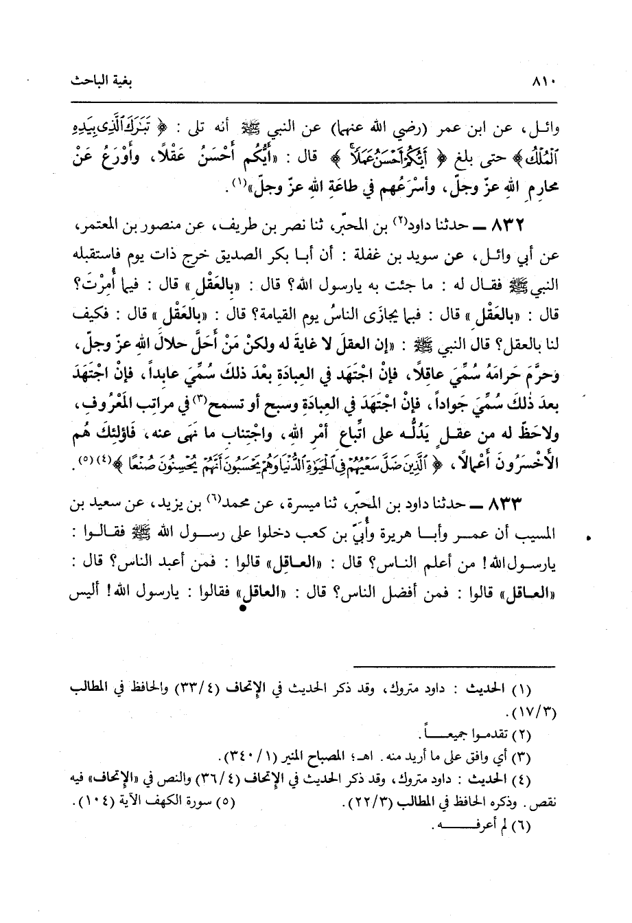 832 - حَدَّثَنَا دَاوُدُ بْنُ الْمُحَبَّرِ , ثنا نَصْرُ بْنُ طَرِيفٍ , عَنْ مَنْصُورِ بْنِ الْمُعْتَمِرِ , عَنْ أَبِي وَائِلٍ , عَنْ سُوَيْدِ بْنِ غَفَلَةَ , أَنَّ أَبَا بَكْرٍ الصِّدِّيقَ , خَرَجَ ذَاتَ يَوْمٍ فَاسْتَقْبَلَهُ النَّبِيُّ صَلَّى اللهُ عَلَيْهِ وَسَلَّمَ فَقَالَ لَهُ: " §مَا جِئْتَ بِهِ يَا رَسُولَ اللَّهِ؟ قَالَ: «بِالْعَقْلِ» , قَالَ: فَبِمَ أُمِرْتَ؟ قَالَ: «بِالْعَقْلِ» قَالَ: فَبِمَ يُجَازَى النَّاسُ يَوْمَ الْقِيَامَةِ؟ قَالَ: «بِالْعَقْلِ» قَالَ: فَكَيْفَ لَنَا بِالْعَقْلِ؟ قَالَ النَّبِيُّ صَلَّى اللهُ عَلَيْهِ وَسَلَّمَ: إِنَّ الْعَقْلَ لَا غَايَةَ لَهُ وَلَكِنْ مَنْ أَحَلَّ حَلَالَ اللَّهِ عَزَّ وَجَلَّ وَحَرَّمَ حَرَامَهُ سُمِّيَ عَاقِلًا , فَإِنِ اجْتَهَدَ فِي الْعِبَادَةِ بَعْدَ ذَلِكَ سُمِّيَ عَابِدًا , فَإِنِ اجْتَهَدَ بَعْدَ ذَلِكَ سُمِّيَ جَوَادًا , فَإِنِ اجْتَهَدَ فِي الْعِبَادَةِ وَسَمَحَ أَوْ تَسَمَّحَ فِي مَرَاتِبِ الْمَعْرُوفِ وَلَا حَظَّ لَهُ مِنْ عَقْلٍ يَدُلُّهُ عَلَى اتِّبَاعِ أَمْرِ اللَّهِ وَاجْتِنَابِ مَا نَهَى عَنْهُ فَأُؤلَئِكَ هُمُ الْأَخْسَرُونَ أَعْمَالًا , الَّذِينَ ضَلَّ سَعْيُهُمْ فِي الْحَيَاةِ الدُّنْيَا وَهُمْ يَحْسَبُونَ أَنَّهُمْ يُحْسِنُونَ صُنْعًا "