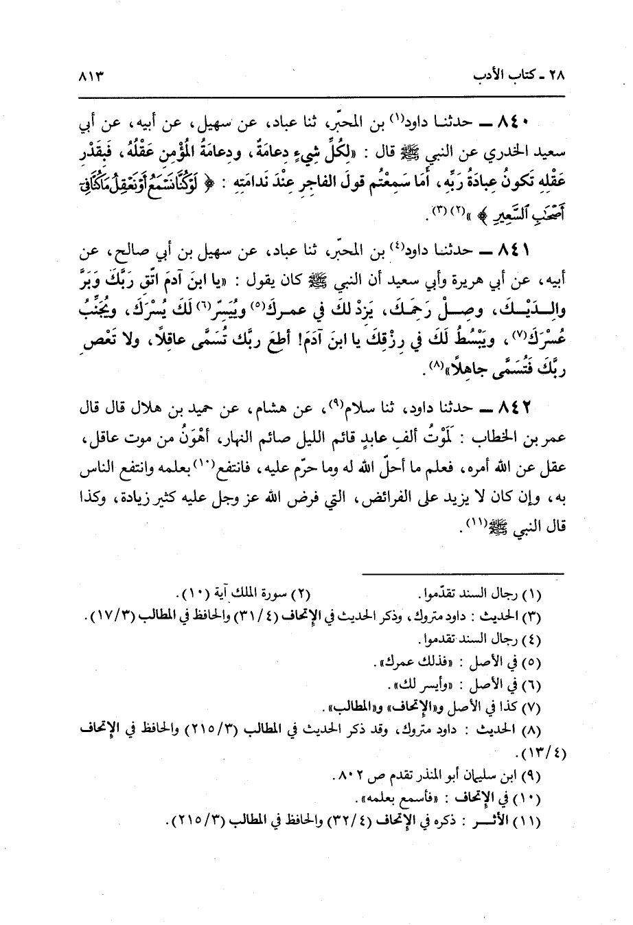 841 - حَدَّثَنَا دَاوُدُ بْنُ الْمُحَبَّرِ , ثنا عَبَّادٌ , عَنْ سُهَيْلِ بْنِ أَبِي صَالِحٍ , عَنْ أَبِيهِ , عَنْ أَبِي هُرَيْرَةَ , وَأَبِي سَعِيدٍ أَنَّ النَّبِيَّ صَلَّى اللهُ عَلَيْهِ وَسَلَّمَ كَانَ يَقُولُ: «يَا ابْنَ آدَمَ» §اتَّقِ رَبَّكَ وَبِرَّ وَالِدَيْكَ وَصْلِ رَحِمَكَ يُزَدْ لَكَ فِي عُمُرِكَ وَيُيَسَّرْ لَكَ يُسْرُكَ وَيُجَنَّبْ عُسْرَكَ وَيُبْسَطْ لَكَ فِي رِزْقِكَ , يَا ابْنَ آدَمَ أَطِعْ رَبَّكَ تُسَمَّى عَاقِلًا , وَلَا تَعْصِ رَبَّكَ فَتَسَمَّى جَاهِلًا "