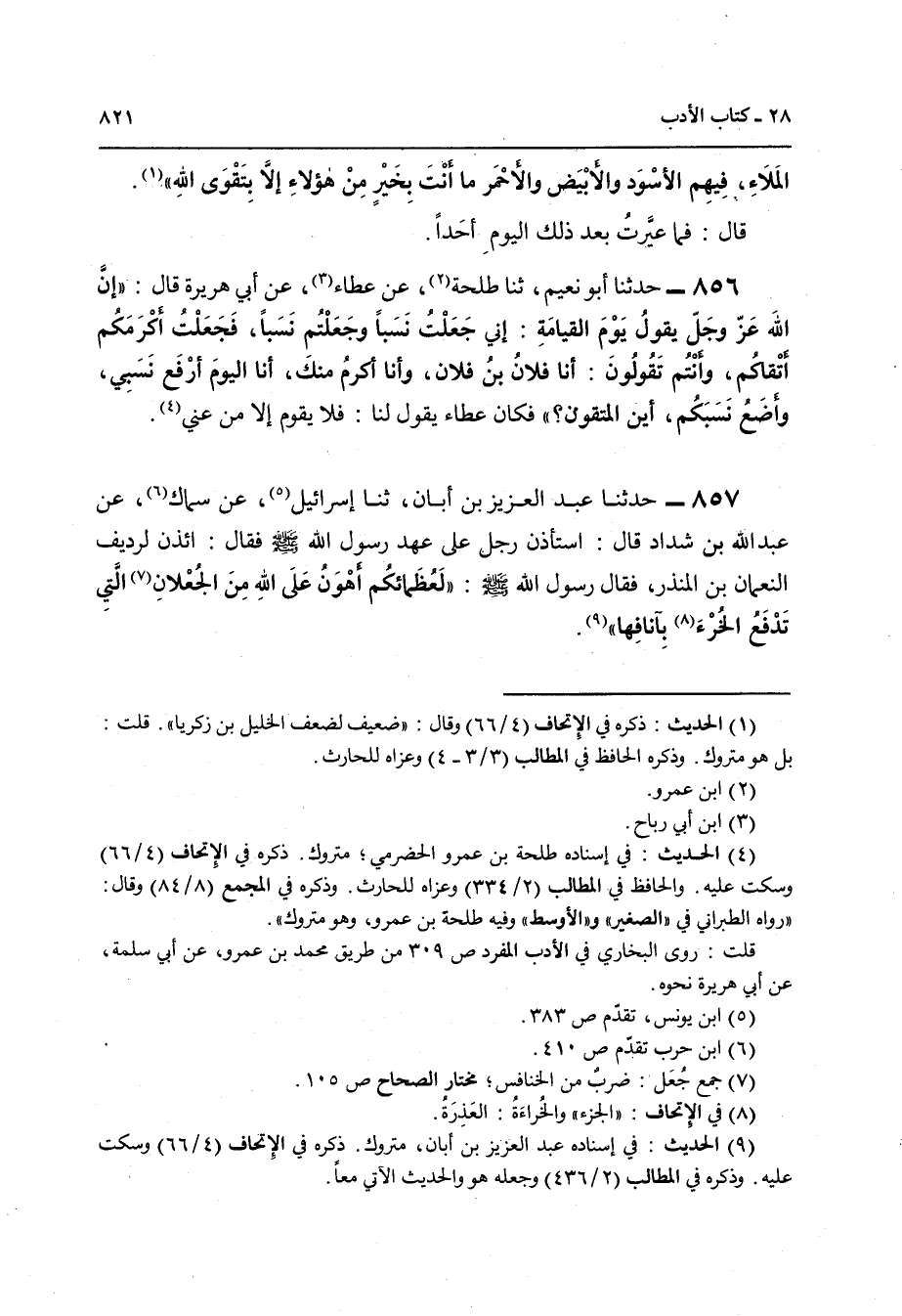 856 - حَدَّثَنَا أَبُو نُعَيْمٍ , ثَنَا طَلْحَةُ , عَنْ عَطَاءٍ , عَنْ أَبِي هُرَيْرَةَ قَالَ: إِنَّ «§اللَّهَ عَزَّ وَجَلَّ يَقُولُ يَوْمَ الْقِيَامَةِ إِنِّي جَعَلْتُ نَسَبًا وَجَعَلْتُمْ نَسَبًا , فَجَعَلْتُ أَكْرَمَكُمْ أَتْقَاكُمْ , وَأَنْتُمْ تَقُولُونَ أَنَا فُلَانُ بْنُ فُلَانٍ , وَأَنَا أَكْرَمُ مِنْكَ , وَأَنَا الْيَوْمَ أَرْفَعُ نَسَبِي , وَأَضَعُ نَسَبَكُمْ , أَيْنَ الْمُتَّقُونَ» , فَكَانَ عَطَاءٌ يَقُولُ لَنَا: فَلَا يَقُومُ إِلَّا مَنْ عُنِيَ