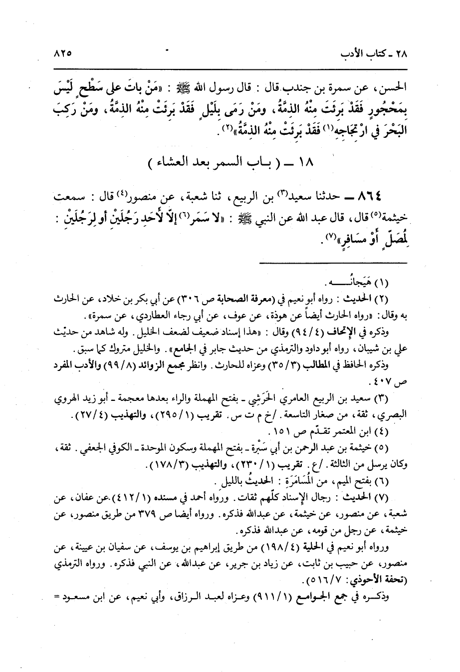 864 - حَدَّثَنَا سَعِيدُ بْنُ الرَّبِيعِ , ثنا شُعْبَةُ , عَنْ مَنْصُورٍ قَالَ: سَمِعْتُ خَيْثَمَةَ قَالَ: قَالَ عَبْدُ اللَّهِ عَنِ النَّبِيِّ صَلَّى اللهُ عَلَيْهِ وَسَلَّمَ: " §لَا سَمَرَ إِلَّا لِأَحَدِ رَجُلَيْنِ أَوْ لِرَجُلَيْنِ: لِمُصَلٍّ أَوْ مُسَافِرٍ "