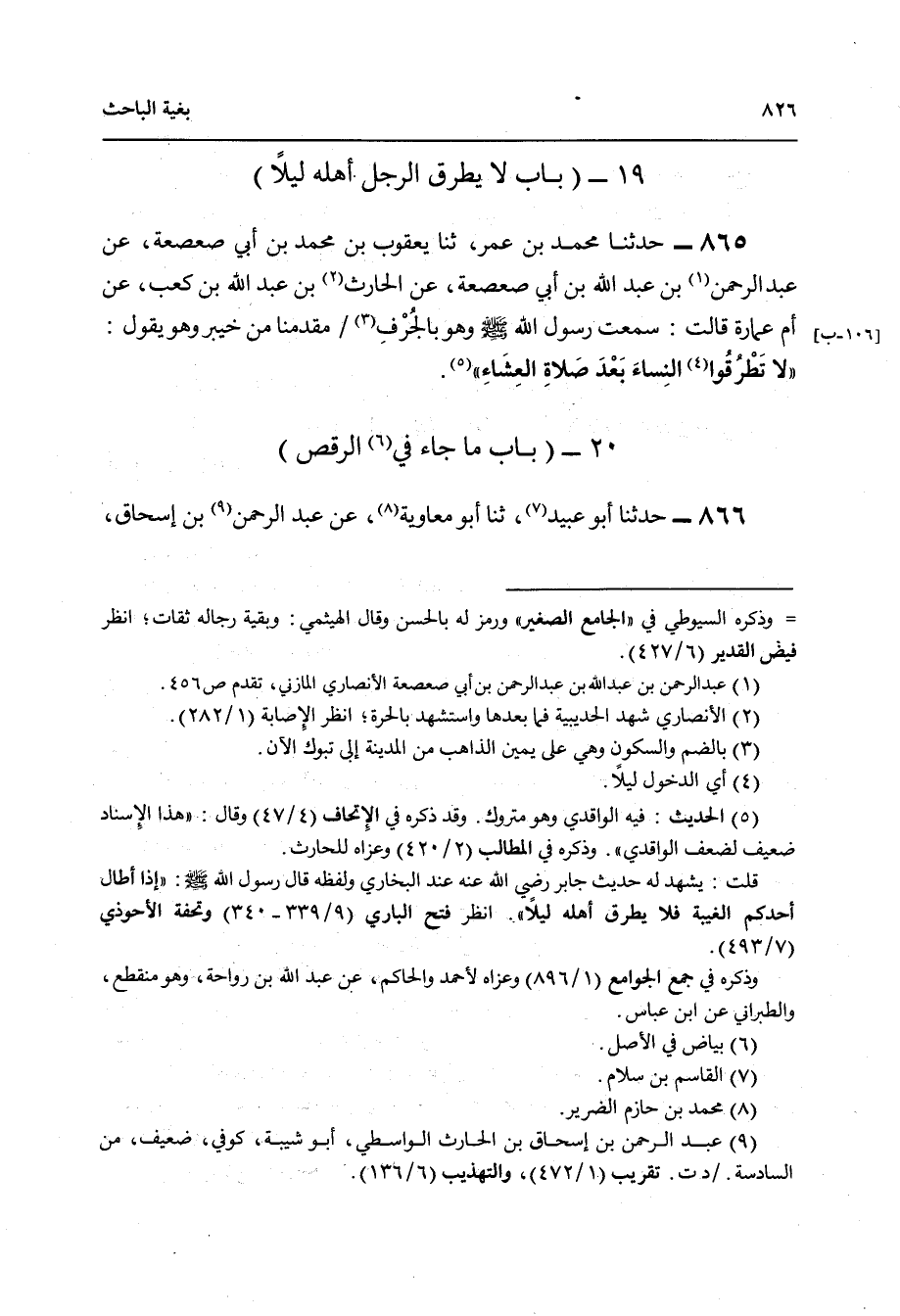 865 - حَدَّثَنَا مُحَمَّدُ بْنُ عُمَرَ , ثنا يَعْقُوبُ بْنُ مُحَمَّدِ بْنِ أَبِي صَعْصَعَةَ , عَنْ عَبْدِ الرَّحْمَنِ بْنِ عَبْدِ اللَّهِ بْنِ أَبِي صَعْصَعَةَ , عَنِ الْحَارِثِ بْنِ عَبْدِ اللَّهِ بْنِ كَعْبٍ , عَنْ أُمِّ عُمَارَةَ قَالَتْ: سَمِعْتُ رَسُولَ اللَّهِ صَلَّى اللهُ عَلَيْهِ وَسَلَّمَ وَهُوَ بِالْجُرُفِ مَقْدِمَنَا مِنْ خَيْبَرَ وَهُوَ يَقُولُ: «§لَا تَطْرُقُوا النِّسَاءَ بَعْدَ صَلَاةِ الْعِشَاءِ»