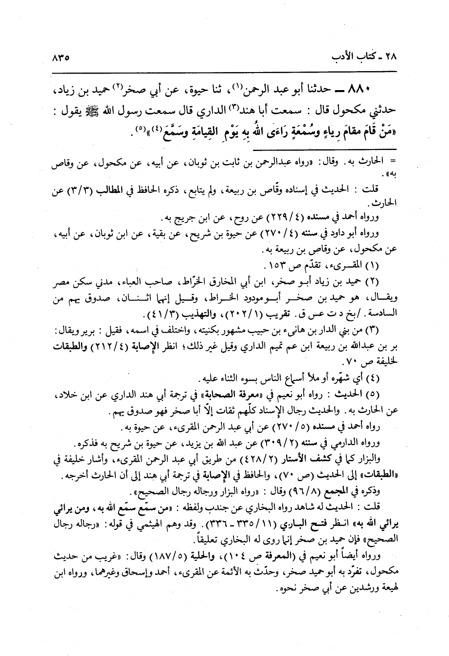 880 - حَدَّثَنَا أَبُو عَبْدِ الرَّحْمَنِ , ثنا حَيْوَةُ , عَنْ أَبِي صَخْرٍ حُمَيْدِ بْنِ زِيَادٍ , حَدَّثَنِي مَكْحُولٌ قَالَ: سَمِعْتُ أَبَا هِنْدٍ الدَّارِيَّ قَالَ: سَمِعْتُ رَسُولَ اللَّهِ صَلَّى اللهُ عَلَيْهِ وَسَلَّمَ يَقُولُ: «§مَنْ قَامَ مَقَامَ رِيَاءٍ وَسُمْعَةٍ رَاءَى اللَّهُ بِهِ يَوْمَ الْقِيَامَةِ وَسَمَّعَ»