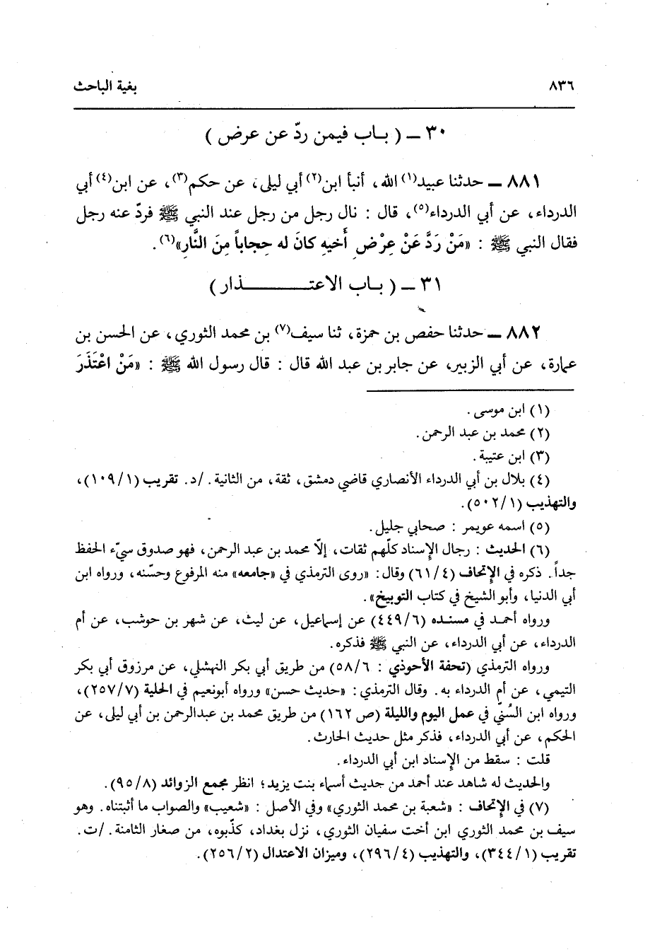 881 - حَدَّثَنَا عُبَيْدُ اللَّهِ , أنبأ ابْنُ أَبِي لَيْلَى , عَنِ حَكَمٍ , عَنِ ابْنِ أَبِي الدَّرْدَاءِ , عَنْ أَبِي الدَّرْدَاءِ قَالَ: نَالَ رَجُلٌ مِنْ رَجُلٍ عِنْدَ النَّبِيِّ صَلَّى اللهُ عَلَيْهِ وَسَلَّمَ , فَرَدَّ عَنْهُ رَجُلٌ , فَقَالَ النَّبِيُّ صَلَّى اللهُ عَلَيْهِ وَسَلَّمَ: «§مَنْ رَدَّ عَنْ عِرْضِ أَخِيهِ كَانَ لَهُ حِجَابًا مِنَ النَّارِ»