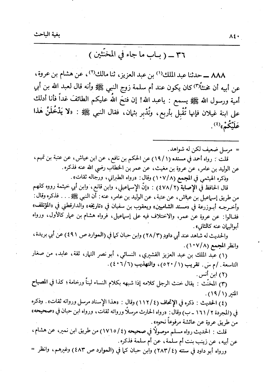 888 - حَدَّثَنَا عَبْدُ الْمَلِكِ بْنُ عَبْدِ الْعَزِيزِ , ثنا مَالِكٌ , عَنْ هِشَامِ بْنِ عُرْوَةَ , عَنْ أَبِيهِ , أَنَّ مُخَنَّثًا كَانَ يَكُونُ عِنْدَ أُمِّ سَلَمَةَ زَوْجِ النَّبِيِّ صَلَّى اللهُ عَلَيْهِ وَسَلَّمَ وَإِنَّهُ قَالَ لِعَبْدِ اللَّهِ بْنِ أَبِي أُمَيَّةَ وَرَسُولُ اللَّهِ صَلَّى اللهُ عَلَيْهِ وَسَلَّمَ يَسْمَعُ: يَا عَبْدَ اللَّهِ إِنْ فَتَحَ اللَّهُ عَلَيْكُمُ الطَّائِفَ غَدًا فَأَنَا أَدُلُّكَ عَلَى ابْنَةِ غَيْلَانَ , فَإِنَّهَا تُقْبِلُ بِأَرْبَعٍ وَتُدْبِرُ بِثَمَانٍ , فَقَالَ النَّبِيُّ صَلَّى اللهُ عَلَيْهِ وَسَلَّمَ: «§لَا يَدْخُلَنَّ هَذَا عَلَيْكُمْ»
