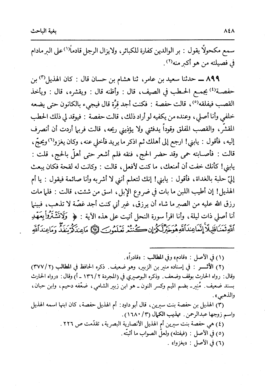 899 - حَدَّثَنَا سَعِيدُ بْنُ عَامِرٍ , ثنا هِشَامُ بْنُ حَسَّانَ , قَالَ: كَانَ الْهُذَيْلُ بْنُ حَفْصَةَ " §يَجْمَعُ الْحَطَبَ فِي الصَّيْفِ , قَالَ: وَأَظُنُّهُ قَالَ: وَيُقَشِّرُهُ , قَالَ: وَيَأْخُذُ الْقَصَبَ فَيَفْلَقُهُ , قَالَتْ حَفْصَةُ: فَكُنْتُ أَجِدُ قُرَّةً , قَالَ: فَيَجِيءُ بِالْكَانُونِ حَتَّى يَضَعَهُ خَلْفِي وَأَنَا أُصَلِّي , وَعِنْدَهُ مَنْ يَكْفِيهِ لَوْ أَرَادَ ذَلِكَ , قَالَتْ حَفْصَةُ: فَيُوقِدُ لِي ذَلِكَ الْحَطَبَ الْمُقَشَّرَ وَالْقَصَبَ الْمُفَلَّقَ وَقُودًا يُدْفِئُنِي وَلَا يُؤْذِينِي رِيحُهُ , قَالَتْ: فَرُبَّمَا أَرَدْتُ أَنْ أَنْصَرِفَ إِلَيْهِ فَأَقُولَ يَا بُنَيَّ ارْجِعْ إِلَى أَهْلِكَ ثُمَّ أَذْكُرُ مَا يُرِيدُ , فَأُخَلِّي عَنْهُ وَكَانَ يَغْزُو وَيَحُجُّ قَالَتْ: فَأَصَابَتْهُ حُمَّى وَقَدْ حَضَرَ الْحَجُّ , فَنَقِهَ فَلَمْ أَشْعُرْ حَتَّى أَهَلَّ بِالْحَجِّ , قُلْتُ: يَا بُنَيَّ كَأَنَّكَ خِفْتَ أَنْ أَمْنَعَكَ مَا كُنْتُ لِأَفْعَلَ , قَالَتْ: وَكَانَتْ لَهُ لِقْحَةٌ فَكَانَ يَبْعَثُ إِلَيَّ حَلْبَةً بِالْغَدَاةِ , فَأَقُولُ يَا بُنَيَّ إِنَّكَ لَتَعْلَمُ أَنَّنِي لَا أَشْرَبُهُ وَأَنَا صَائِمَةٌ , فَيَقُولُ: يَا أُمَّ الْهُذَيْلِ إِنَّ أَطْيَبَ اللَّبَنِ مَا بَاتَ فِي ضُرُوعِ الْإِبِلِ اسْقِ مَنْ شِئْتِ , قَالَتْ: فَلَمَّا مَاتَ رَزَقَ اللَّهُ عَلَيْهِ مِنَ الصَّبْرِ مَا شَاءَ أَنْ يَرْزُقَ غَيْرَ أَنِّي كُنْتُ أَجِدُ غُصَّةً لَا تَذْهَبُ , فَبَيْنَمَا أَنَا أُصَلِّي ذَاتَ لَيْلَةٍ وَأَنَا أَقْرَأُ سُورَةَ النَّحْلِ أَتَيْتُ عَلَى هَذِهِ الْآيَةِ {وَلَا تَشْتَرُوا بِعَهْدِ اللَّهِ ثَمَنًا قَلِيلًا إِنَّمَا عِنْدَ اللَّهِ هُوَ خَيْرٌ لَكُمْ إِنْ كُنْتُمْ تَعْلَمُونَ مَا عِنْدَكُمْ يَنْفَدُ وَمَا عِنْدَ اللَّهِ بَاقٍ وَلَنَجْزِيَنَّ الَّذِينَ صَبَرُوا أَجْرَهُمْ بِأَحْسَنِ مَا كَانُوا يَعْمَلُونَ} [النحل: 96] فَأَعَدْتُهَا فَأَذْهَبَ اللَّهُ مَا كُنْتُ أَجِدُ "