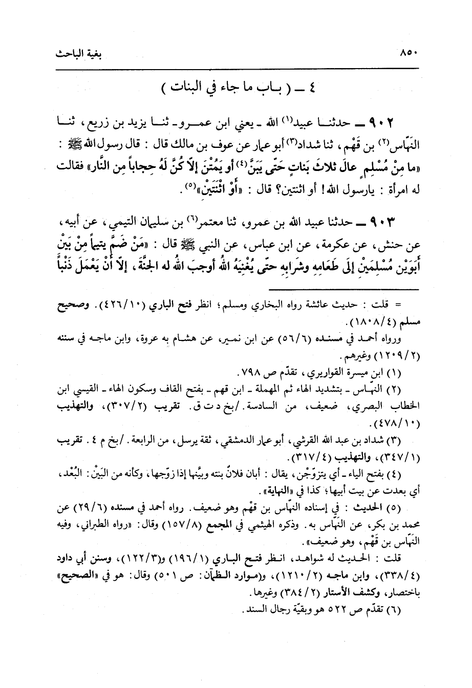 903 - حَدَّثَنَا عُبَيْدُ اللَّهِ بْنُ عَمْرٍو , ثَنَا مُعْتَمِرُ بْنُ سُلَيْمَانَ التَّيْمِيُّ , عَنْ أَبِيهِ , عَنْ حَنَشٍ , عَنْ عِكْرِمَةَ , عَنِ ابْنِ عَبَّاسٍ عَنِ النَّبِيِّ صَلَّى اللهُ عَلَيْهِ وَسَلَّمَ قَالَ: «§مَنْ ضَمَّ يَتِيمًا مِنْ بَيْنِ أَبَوَيْنِ مُسْلِمَيْنِ إِلَى طَعَامِهِ وَشَرَابِهِ حَتَّى يُغْنِيَهُ اللَّهُ أَوْجَبَ اللَّهُ لَهُ الْجَنَّةَ إِلَّا أَنْ يَعْمَلَ ذَنْبًا لَا يُغْفَرُ , وَمَنْ أُذْهِبَ كَرِيمَتَيْهِ فَإِنَّ ثَوَابَهُ عِنْدِي الْجَنَّةَ» , قِيلَ: وَمَا كَرِيمَتَاهُ؟ قَالَ: «عَيْنَاهُ , وَمَنْ عَالَ ثَلَاثَ بَنَاتٍ يَرْحَمُهُنَّ وَيُنْفِقُ عَلَيْهِنَّ وَيُحْسِنُ أَدَبَهُنَّ دَخَلَ الْجَنَّةَ» , فَقَالَ لَهُ أَعْرَابِيٌّ: يَا رَسُولَ اللَّهِ , أَوِ اثْنَتَيْنِ؟ قَالَ: «أَوِ اثْنَتَيْنِ» قَالَ: قَالَ ابْنُ عَبَّاسٍ: هَذَا وَاللَّهِ مِنْ كَرَائِمِ الْحَدِيثِ وَغُرَرِهِ , قُلْتُ: رَوَى التَّرِمْذِيُّ مِنْهُ إِلَى قَوْلِهِ: «إِلَّا أَنْ يَعْمَلَ ذَنْبًا لَا يُغْفَرُ»