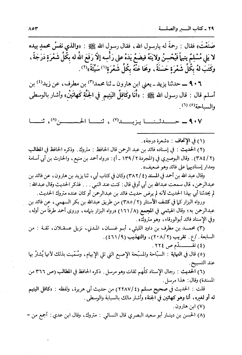 906 - حَدَّثَنَا يَزِيدُ يَعْنِي ابْنَ هَارُونَ , ثنا مُحَمَّدُ بْنُ مُطَرِّفٍ , عَنْ زَيْدِ بْنِ أَسْلَمَ قَالَ: قَالَ رَسُولُ اللَّهِ صَلَّى اللهُ عَلَيْهِ وَسَلَّمَ: «§أَنَا وَكَافِلُ الْيَتِيمِ فِي الْجَنَّةِ كَهَاتَيْنِ» , وَأَشَارَ بِالْوُسْطَى وَالسَّبَّابَةِ "