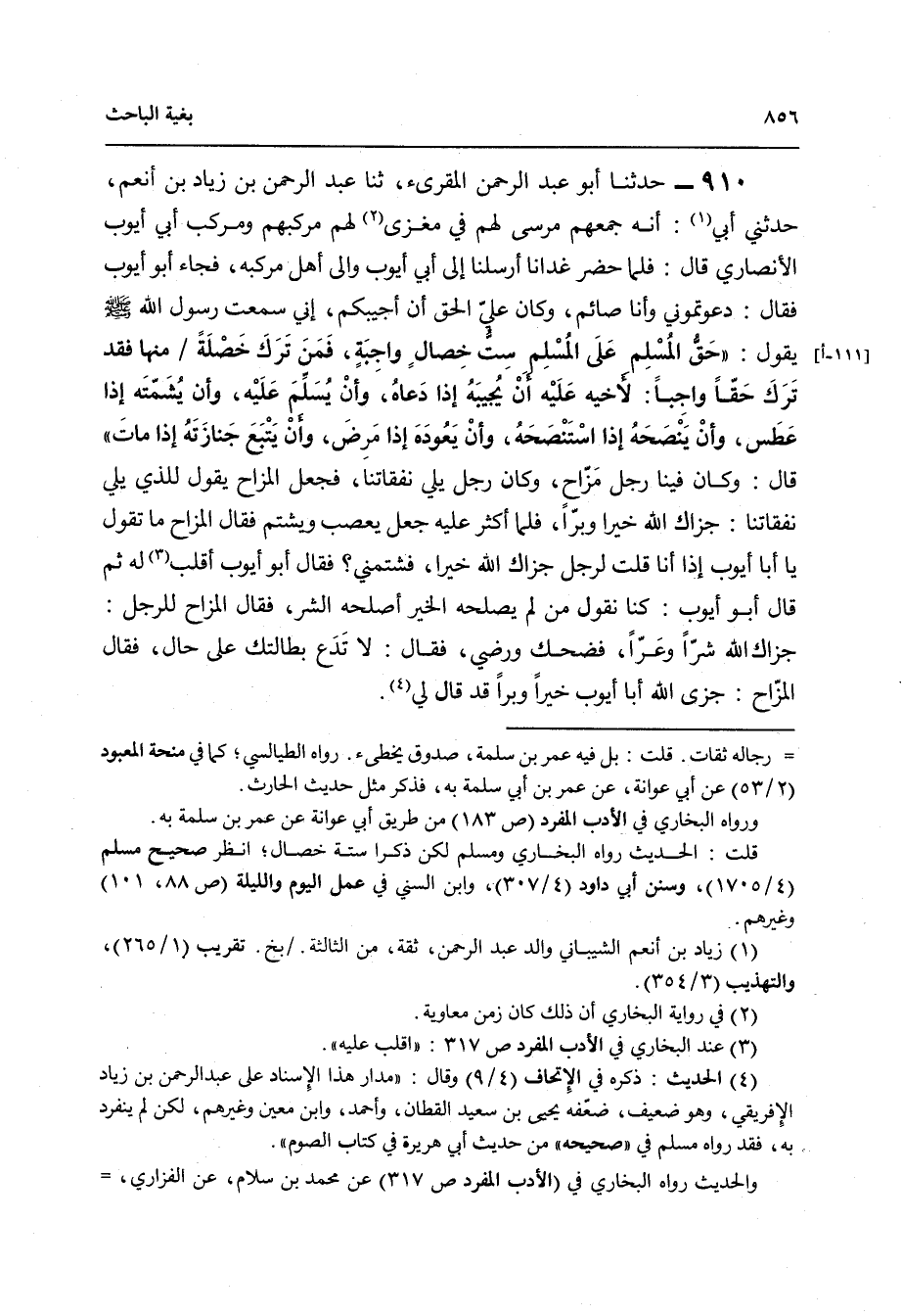 910 - حَدَّثَنَا أَبُو عَبْدِ الرَّحْمَنِ الْمُقْرِئُ , ثنا عَبْدُ الرَّحْمَنِ بْنُ زِيَادِ بْنِ أَنْعَمَ , حَدَّثَنِي أَبِي أَنَّهُ , جَمَعَهُمْ مَرْسًى لَهُمْ فِي مَغْزًى لَهُمْ مَرْكَبُهُمْ وَمَرْكَبُ أَبِي أَيُّوبَ الْأَنْصَارِيِّ قَالَ: فَلَمَّا حَضَرَ غَدَاؤُنَا أَرْسَلْنَا إِلَى أَبِي أَيُّوبَ وَإِلَى أَهْلِ مَرْكَبِهِ , فَجَاءَ أَبُو أَيُّوبَ فَقَالَ: دَعَوْتُمُونِي وَأَنَا صَائِمٌ وَكَانَ عَلَيَّ الْحَقُّ أَنْ أُجِيبَكُمْ إِنِّي سَمِعْتُ رَسُولَ اللَّهِ صَلَّى اللهُ عَلَيْهِ وَسَلَّمَ يَقُولُ: " §حَقُّ الْمُسْلِمِ عَلَى الْمُسْلِمِ سِتُّ خِصَالٍ وَاجِبَةٍ , فَمَنْ تَرَكَ خَصْلَةً مِنْهَا فَقَدْ تَرَكَ حَقًّا وَاجِبًا لِأَخِيهِ عَلَيْهِ: أَنْ يُجِيبَهُ إِذَا دَعَاهُ , وَأَنْ يُسَلِّمَ عَلَيْهِ , وَأَنْ يُشَمِّتَهُ إِذَا عَطَسَ , وَأَنْ يَنْصَحَهُ إِذَا اسْتَنْصَحَهُ وَأَنْ يَعُودَهُ إِذَا مَرِضَ , وَأَنْ يَتْبَعَ جَنَازَتَهُ إِذَا مَاتَ " , قَالَ: وَكَانَ فِينَا رَجُلٌ مَزَّاحٌ وَكَانَ رَجُلٌ يَلِي نَفَقَاتِنَا فَجَعَلَ الْمَزَّاحُ يَقُولُ لِلَّذِي يَلِي نَفَقَاتِنَا جَزَاكَ اللَّهُ خَيْرًا وَبِرًّا , فَلَمَّا أَكْثَرَ عَلَيْهِ جَعَلَ يَغْضَبُ وَيَشْتُمُ , فَقَالَ الْمَزَّاحُ: مَا تَقُولُ يَا أَبَا أَيُّوبَ إِذَا أَنَا قُلْتُ لِرَجُلٍ: جَزَاكَ اللَّهُ خَيْرًا فَشَتَمَنِي؟ فَقَالَ أَبُو أَيُّوبَ: اقْلِبْ لَهُ , ثُمَّ قَالَ أَبُو أَيُّوبَ: كُنَّا نَقُولُ: مَنْ لَمْ يُصْلِحْهُ الْخَيْرُ أَصْلَحَهُ الشَّرُّ , فَقَالَ الْمَزَّاحُ لِلرَّجُلِ: جَزَاكَ اللَّهُ شَرًّا وَعَرًّا فَضَحِكَ وَرَضِيَ , فَقَالَ: لَا تَدَعْ بَطَالَتَكَ عَلَى حَالٍ , فَقَالَ الْمَزَّاحُ: جَزَى اللَّهُ أَبَا أَيُّوبَ خَيْرًا وَبِرًّا قَدْ قَالَ لِي