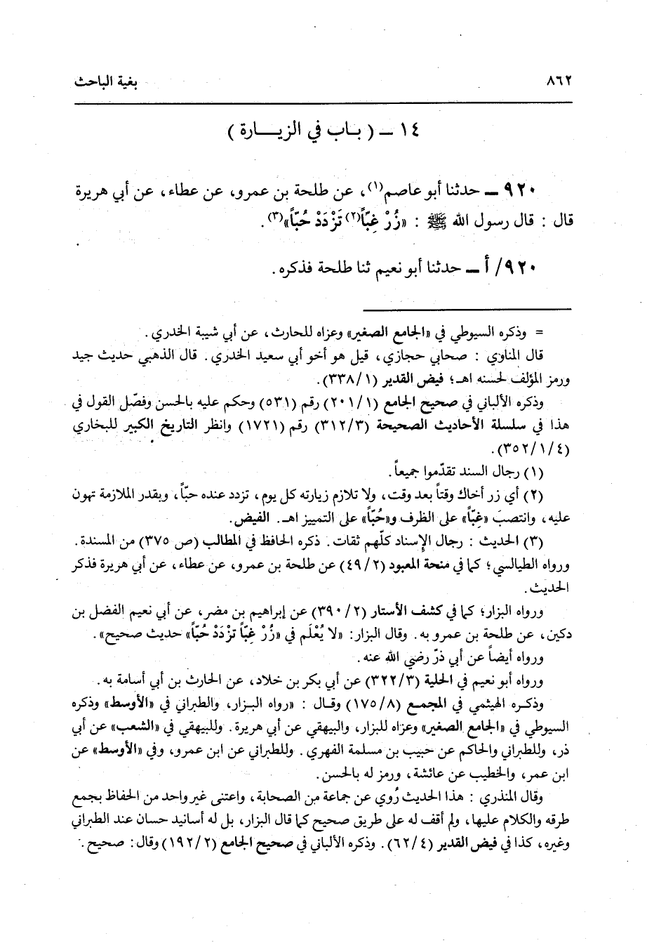920 - حَدَّثَنَا أَبُو عَاصِمٍ , عَنْ طَلْحَةَ بْنِ عَمْرٍو , عَنْ عَطَاءٍ , عَنْ أَبِي هُرَيْرَةَ قَالَ: قَالَ رَسُولُ اللَّهِ صَلَّى اللهُ عَلَيْهِ وَسَلَّمَ: «§زُرْ غِبًّا تَزْدَدْ حُبًّا» حَدَّثَنَا أَبُو نُعَيْمٍ , ثنا طَلْحَةُ , فَذَكَرَهُ