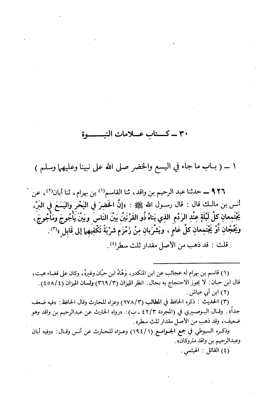 926 - حَدَّثَنَا عَبْدُ الرَّحِيمِ بْنُ وَاقِدٍ , ثنا الْقَاسِمُ بْنُ بَهْرَامَ , ثنا أَبَانُ , عَنْ أَنَسِ بْنِ مَالِكٍ قَالَ: قَالَ رَسُولُ اللَّهِ صَلَّى اللهُ عَلَيْهِ وَسَلَّمَ: إِنَّ «§الْخَضِرَ فِي الْبَحْرِ وَالْيَسَعَ فِي الْبَرِّ , يَجْتَمِعَانِ كُلَّ لَيْلَةٍ عِنْدَ الرَّدْمِ الَّذِي بَنَاهُ ذُو الْقَرْنَيْنِ بَيْنَ النَّاسِ وَبَيْنَ يَأْجُوجَ وَمَأْجُوجَ , وَيَحُجَّانِ أَوْ يَجْتَمِعَانِ كُلَّ عَامٍ , وَيَشْرَبَانِ مِنْ زَمْزَمَ شَرْبَةً تَكْفِيهُمَا إِلَى قَابِلٍ» , قُلْتُ: قَدْ ذَهَبَ مِنَ الْأَصْلِ مِقْدَارُ ثُلُثِ سَطْرٍ