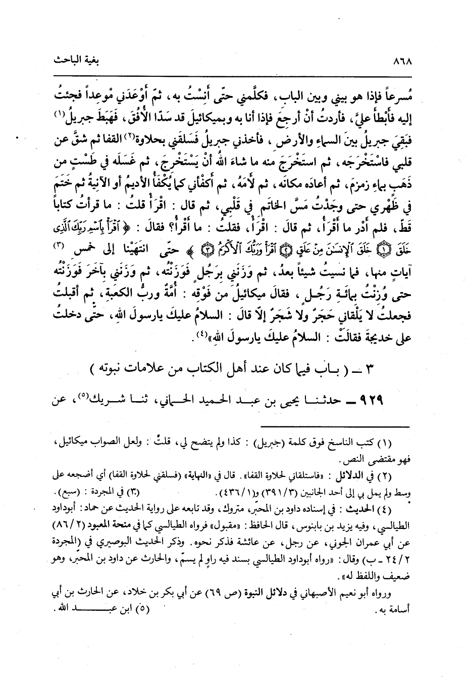929 - حَدَّثَنَا يَحْيَى بْنُ عَبْدِ الْحَمِيدِ الْحِمَّانِيُّ , ثنا شَرِيكٌ , عَنْ عُبَيْدٍ الْمُكْتِبِ , عَنْ أَبِي الطُّفَيْلِ , عَنْ سَلْمَانَ قَالَ: خَرَجْتُ إِلَى الشَّامِ فِي طَلَبِ الْعِلْمِ , فَدُلِلْتُ عَلَى رَاهِبٍ فَسَأَلْتُهُمْ عَنِ النَّبِيِّ صَلَّى اللهُ عَلَيْهِ وَسَلَّمَ فَقَالُوا: قَدْ بَلَغَنَا أَنَّ نَبِيًّا قَدْ ظَهَرَ بِأَرْضِ تِهَامَةَ , فَإِنْ كَانَ يَقْبَلُ الْهَدِيَّةَ , قَالَ: فَدَخَلْتُ إِلَى الْمَدِينَةِ فَأَتَيْتُ النَّبِيَّ صَلَّى اللهُ عَلَيْهِ وَسَلَّمَ بِقِنَاعٍ مِنْ تَمْرٍ , فَقَالَ: «§هَدِيَّةٌ هَذَا أَمْ صَدَقَةٌ؟» , قُلْتُ: بَلْ صَدَقَةٌ , فَقَبَضَ يَدَهُ , وَأَشَارَ إِلَى أَصْحَابِهِ أَنْ كُلُوا , قَالَ: ثُمَّ أَتَيْتُهُ بِقِنَاعٍ مِنْ تَمْرٍ فَقَالَ: «هَدِيَّةٌ هَذَا أَمْ صَدَقَةٌ؟» قُلْتُ: بَلْ هَدِيَّةٌ , قَالَ: فَمَدَّ يَدَهُ فَأَكَلَ وَأَشَارَ إِلَى أَصْحَابِهِ أَنْ كُلُوا , قَالَ: فَقُمْتُ عَلَى رَأْسِهِ فَفَطِنَ لِمَا أُرِيدُ , قَالَ: فَأَلْقَى رِدَاءَهُ عَنْ ظَهْرِهِ قَالَ: فَرَأَيْتُ خَاتَمَ النُّبُوَّةَ فِي ظَهْرِهِ قَالَ: فَأَكْبَبْتُ عَلَيْهِ وَشَهِدْتُ , قَالَ: وَكَاتَبْتُ وَسَأَلْتُ النَّبِيَّ صَلَّى اللهُ عَلَيْهِ وَسَلَّمَ عَنْ مُكَاتَبَتِي , فَنَاوَلَنِي هُنَيْهَةً مِنْ ذَهَبٍ فَلَوْ وُزِنَتْ بِأُحُدٍ لَكَانَتْ أَثْقَلَ مِنْهُ "