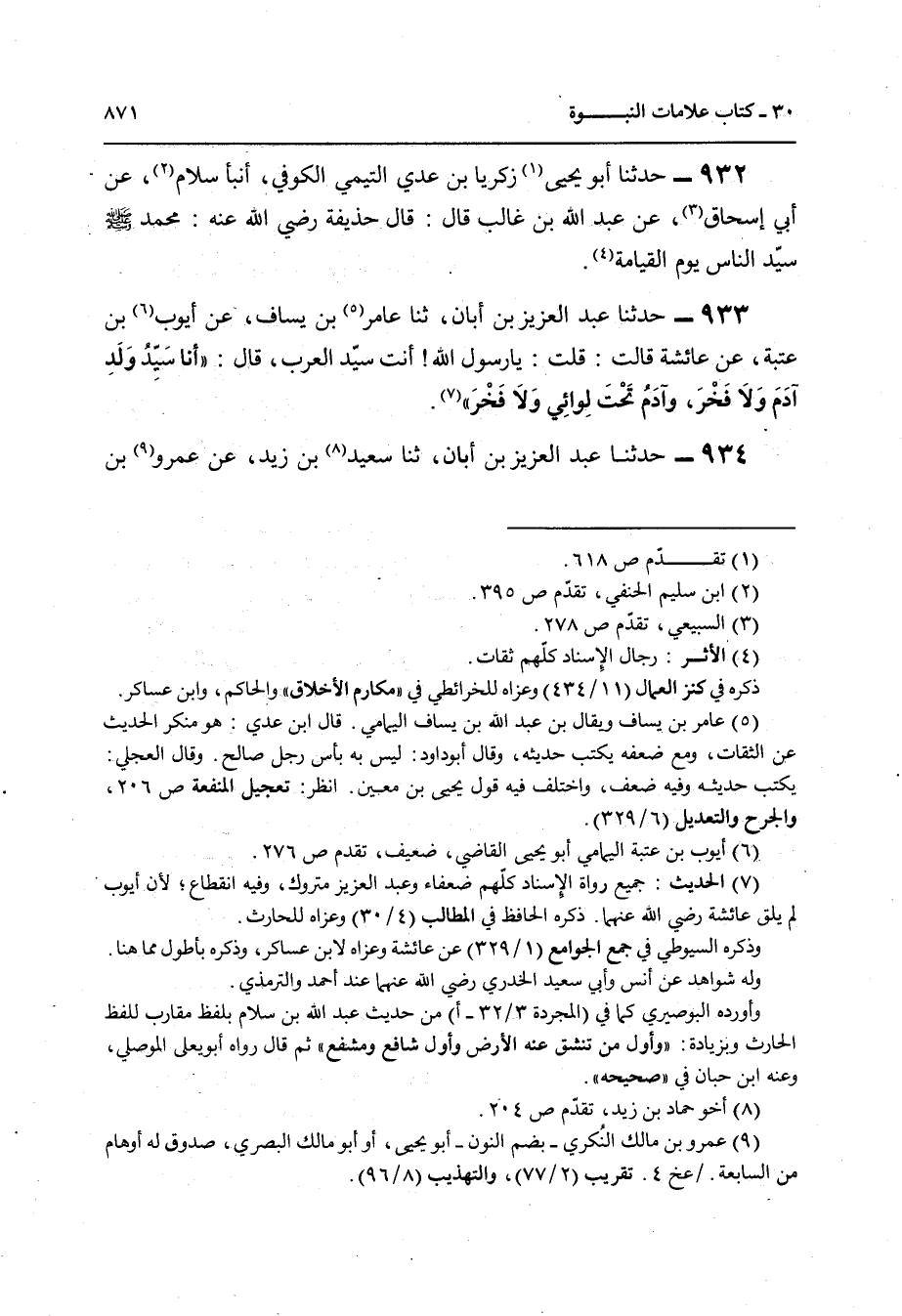 933 - حَدَّثَنَا عَبْدُ الْعَزِيزِ بْنُ أَبَانَ , ثنا عَامِرُ بْنُ يَسَافٍ , عَنْ أَيُّوبَ بْنِ عُتْبَةَ , عَنْ عَائِشَةَ قَالَتْ: قُلْتُ: يَا رَسُولَ اللَّهِ أَنْتَ سَيِّدُ الْعَرَبِ قَالَ: «§أَنَا سَيِّدُ وَلَدِ آدَمَ وَلَا فَخْرَ وَآدَمُ تَحْتَ لِوَائِي وَلَا فَخْرَ»